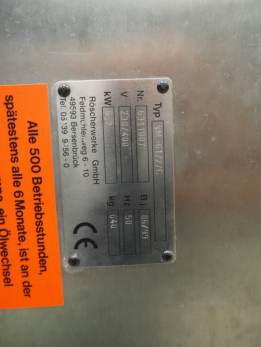Röscherwerke GmbH mobile double chamber vacuum machine, type: VM-61/2/C, number: 6311007, year of construction: 06/99, 230/400 V, 50 Hz, 6.2 kW, weight: 640 kg, seal length: (4x) 860 mm, chamber: (2x) 880 mm x 640 mm, Busch vacuum pump, type: RA 0250 D 561 QMZZ, number: C9920000012, capacity: 250 m³ per hour, total dimensions: 1950 mm x 920 mm x 1100 mm.