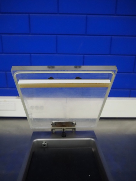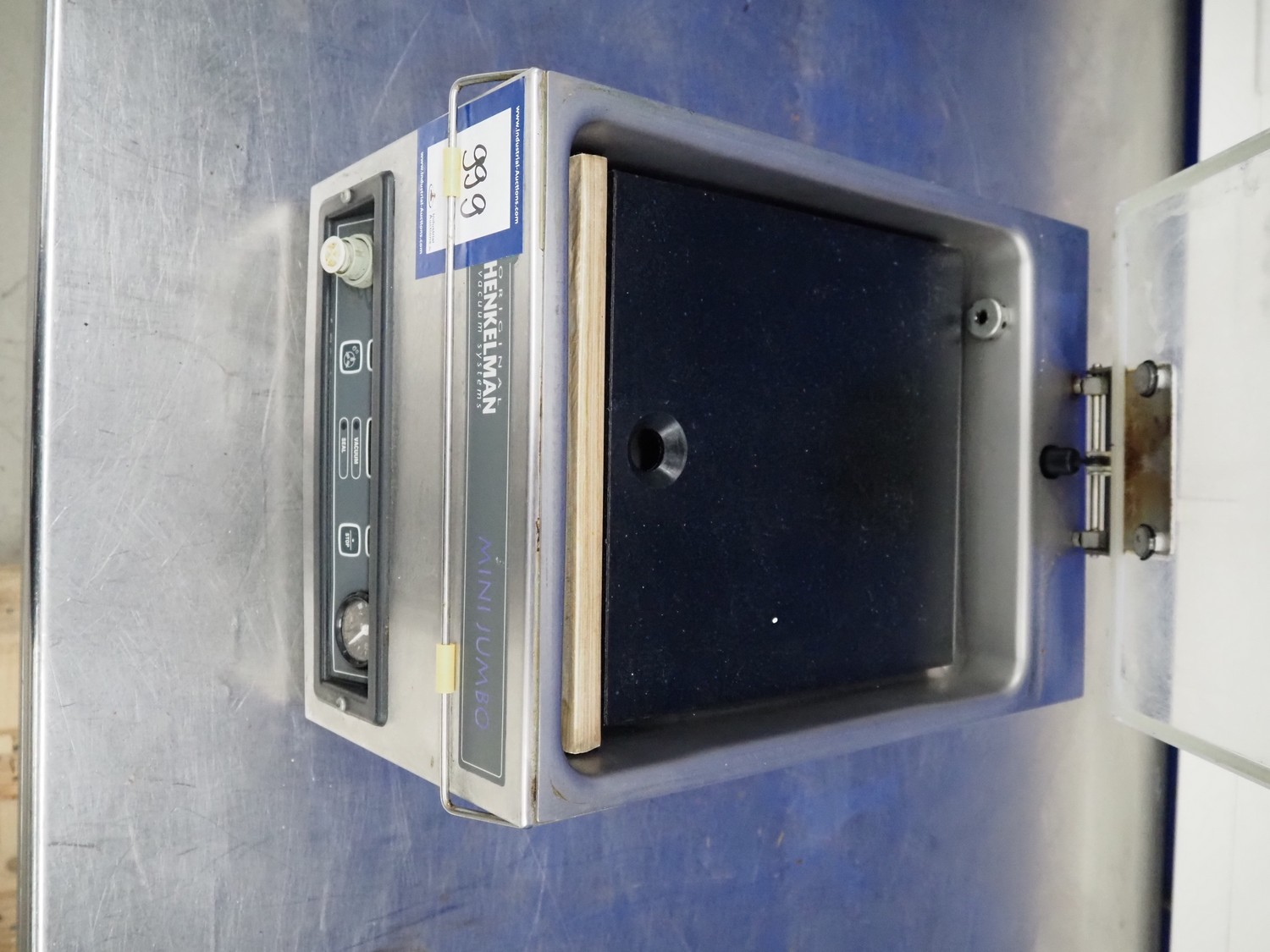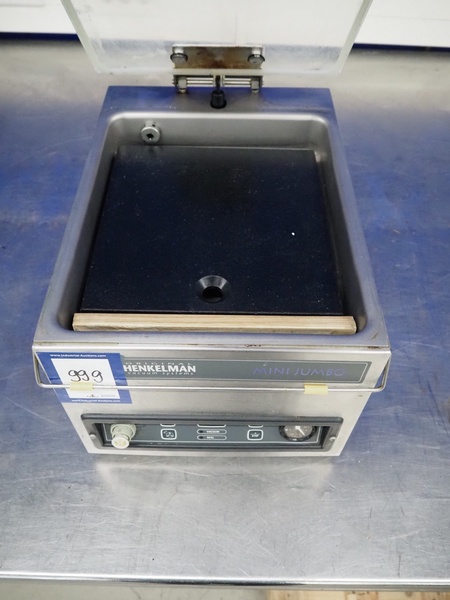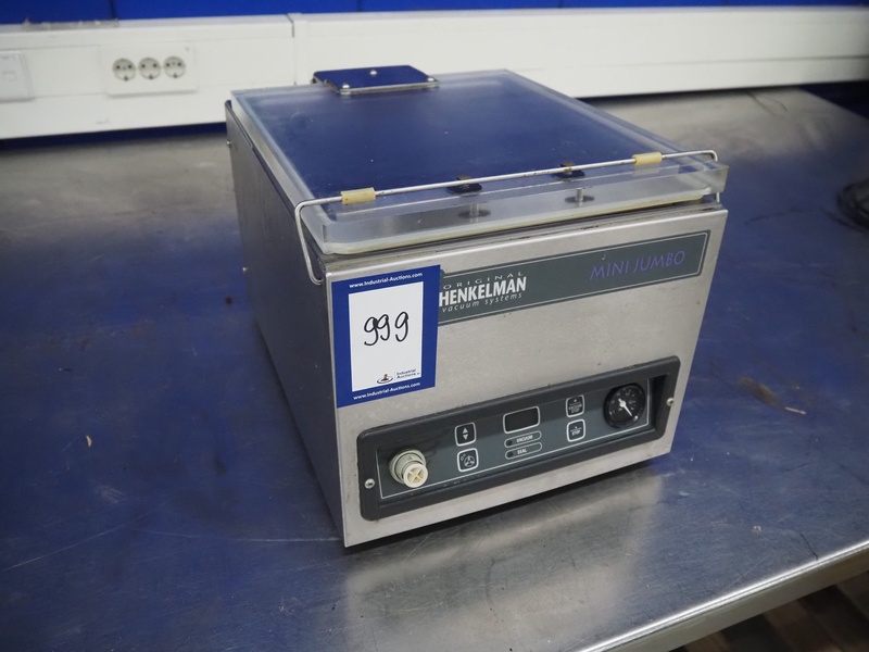 Henkelman vacuum machine, type: Mini Jumbo, machine number: J000411060, year of construction: 2004, 230 V, 1 Ph, 50 Hz, 3 A, 0.4 kW, seal length: 280 mm, dimensions chamber: 340 mm x 280 mm, total dimensions: 450 mm x 330 mm x 300 mm.