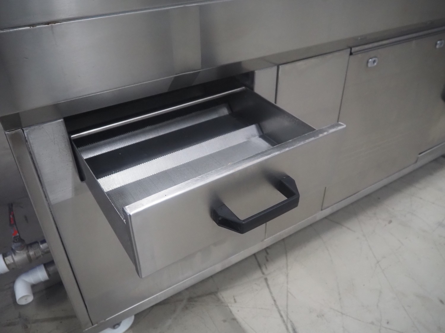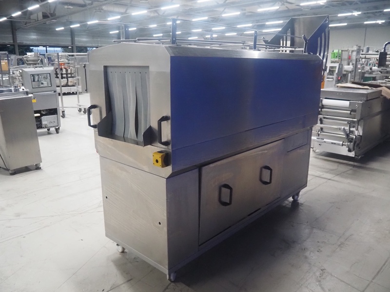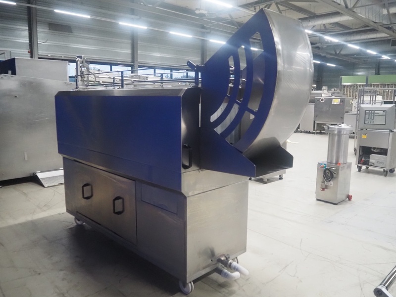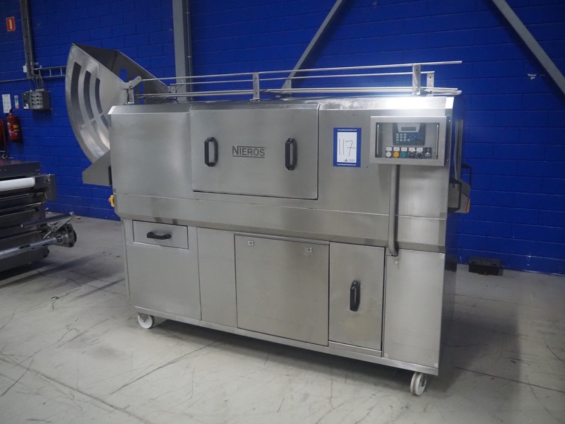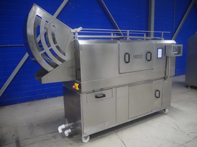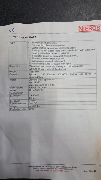 Nieros mobile crate washer, model: CL-T 250, 400 V, 3 Ph, 50 Hz, 33 kW, capacity: 250 crates per hour, clearance: 450 mm x 400 mm, total dimensions: 2800 mm x 1000 mm x 2000 mm.