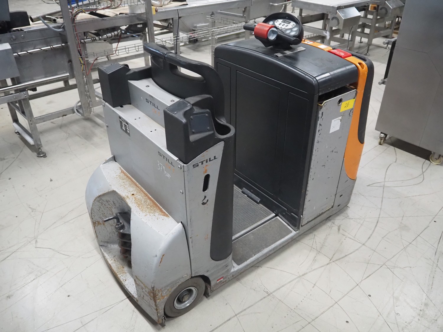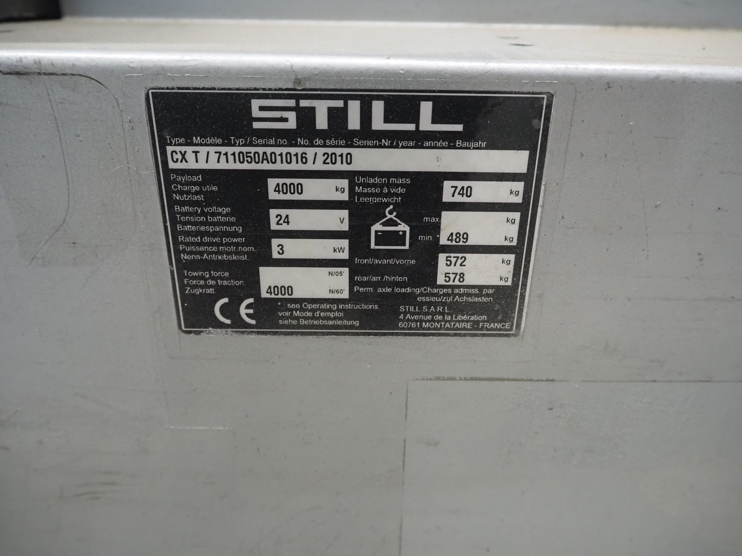 Still electric tow tractor, type: CX-T, serial number: 711050A01016, year of construction: 2010, working hours: 4037 hour, towing capacity: 4000 kg, unladen weight: 740 kg, battery voltage: 24 V, battery weight: min. 489 kg, rated drive power: 3 kW, towing force: 4000 N, front axle load (N°05): 572 kg, rear axle load (N°05): 578 kg, dimensions: 1650 mm x 800 mm x 1300 mm.