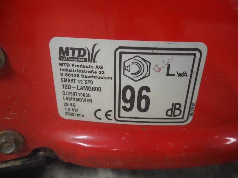 MTD lawnmower, model: SMART 42 SPO, 1.6 kW, weight: 25 kg, dimensions: 1750 mm x 500 mm x 1050 mm.