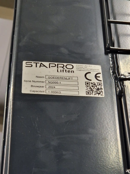 STAPRO Liften B.V. goods elevator, serial number: NQ000-1, year of construction: 2024, capacity: 1000 kg, lifting height: 3500 mm, total dimensions: 3100 mm x 1450 mm x 5200 mm. Lot located on other location in Born (NL). Viewing and pick-up in consultation with Industrial Auctions BV.