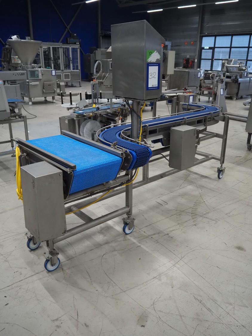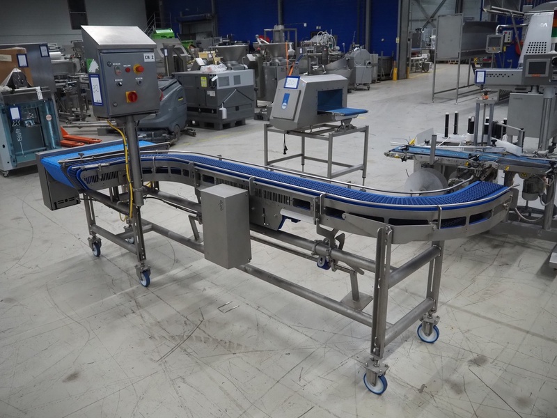 Marvu mobile S-shaped conveyor, type: 360, serial number: 10090153, year of construction: 03/2020, 230-400 V, 50 Hz, 1.26-0.72 A, 0.25 kW, s/s frame, plastic mesh belts, belt width: 150 mm and 380 mm, total dimensions: 3000 mm x 1500 mm x 1850 mm.