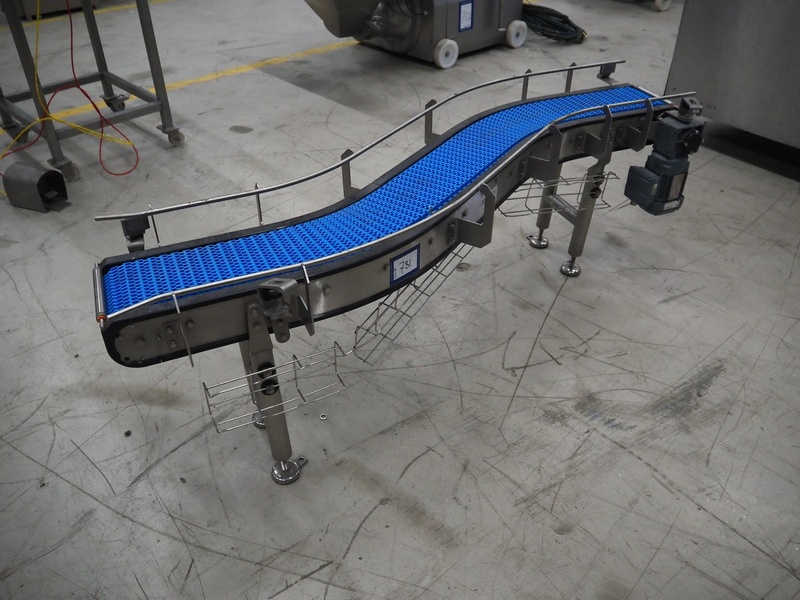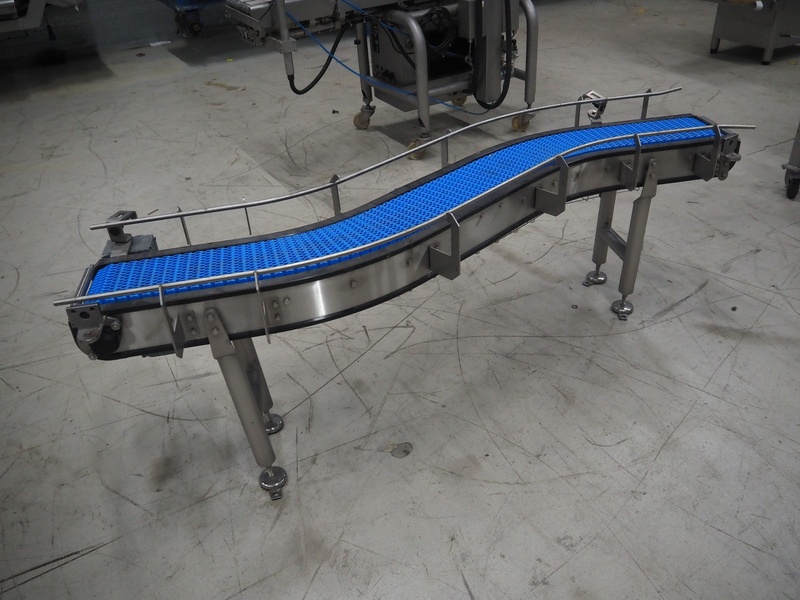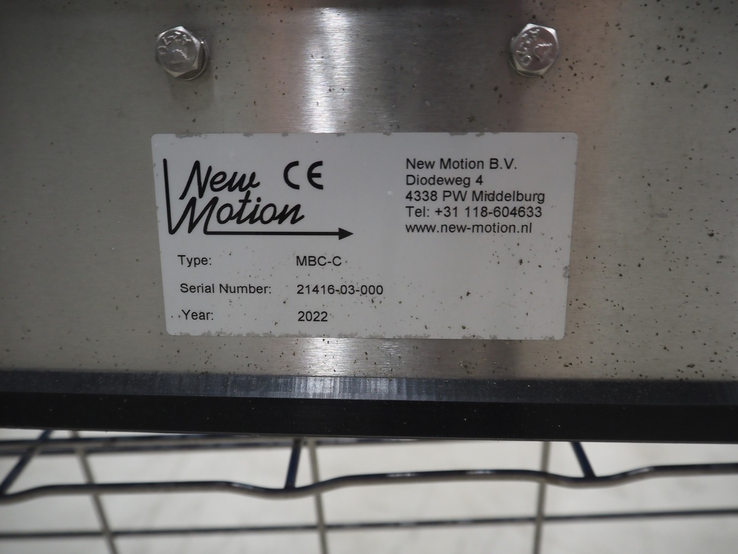 New Motion B.V. s-shaped curve conveyor, type: MBC-C, serial number: 21416-03-000, year of construction: 2022, plastic mesh belt, belt width: 190 mm, total dimensions: 1870 mm x 900 mm x 670 mm.