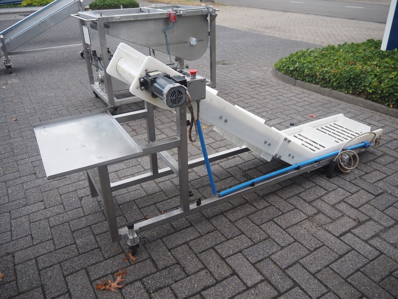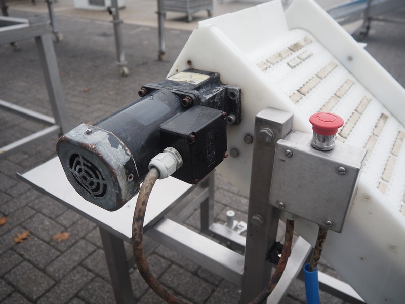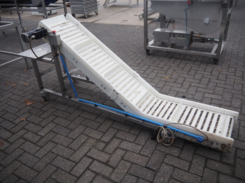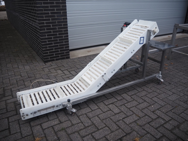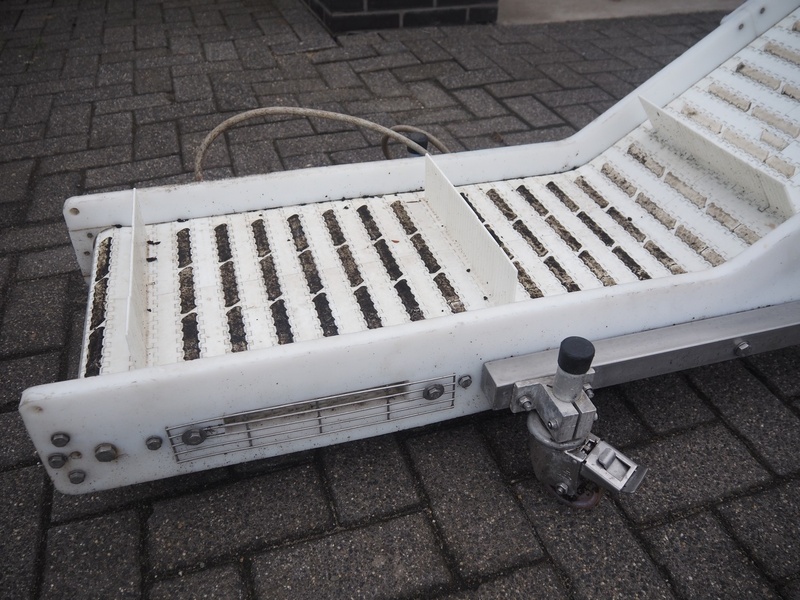Mobile elevating belt with dividers, plastic belt, belt with: 370 mm, distance between dividers: 410 mm, divider height: 75 mm, elevating height: 950 mm, total dimensions: 2450 mm x 750 mm x 1020 mm.