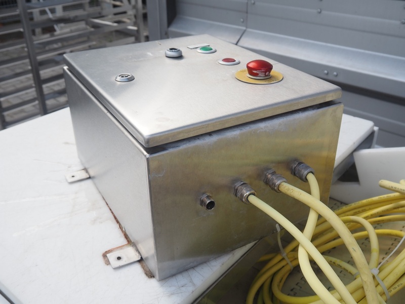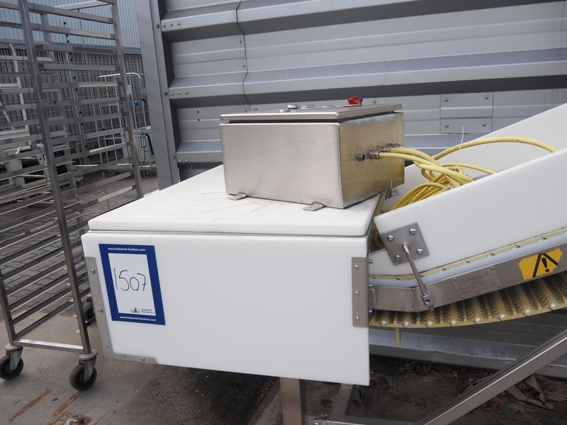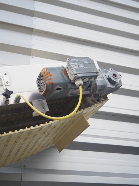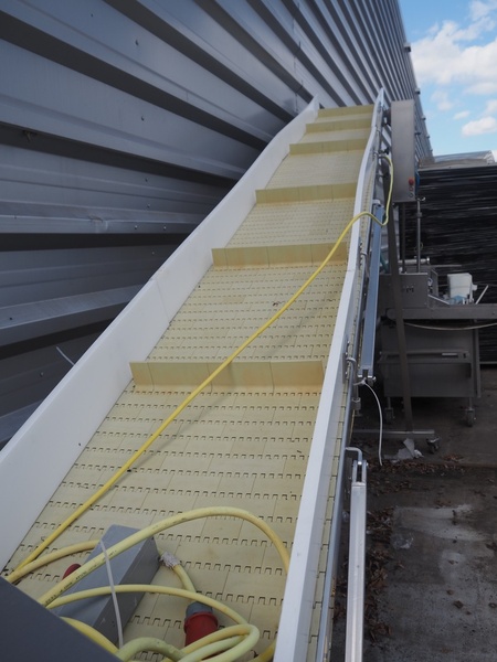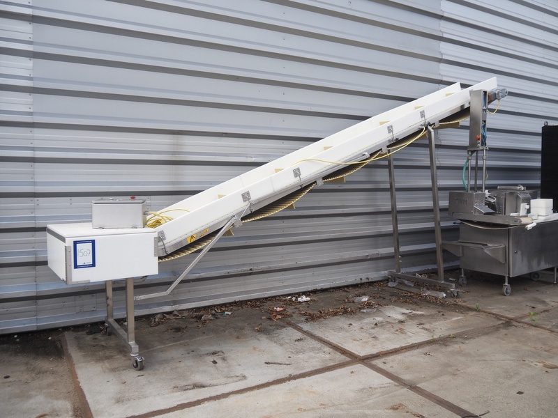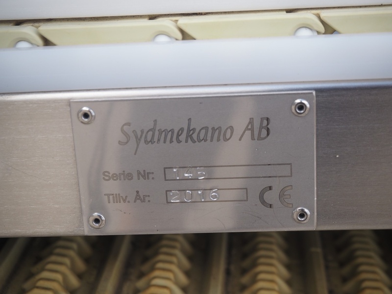 Sydmekano AB mobile elevating belt, serial number: 145, year of construction: 2016, s/s frame, plastic belt with dividers, belt width: 540 mm, divider height: 75 mm, distance between dividers: 700 mm, elevating height: 2700 mm, total dimensions: 5700 mm x 900 mm x 2850 mm.
