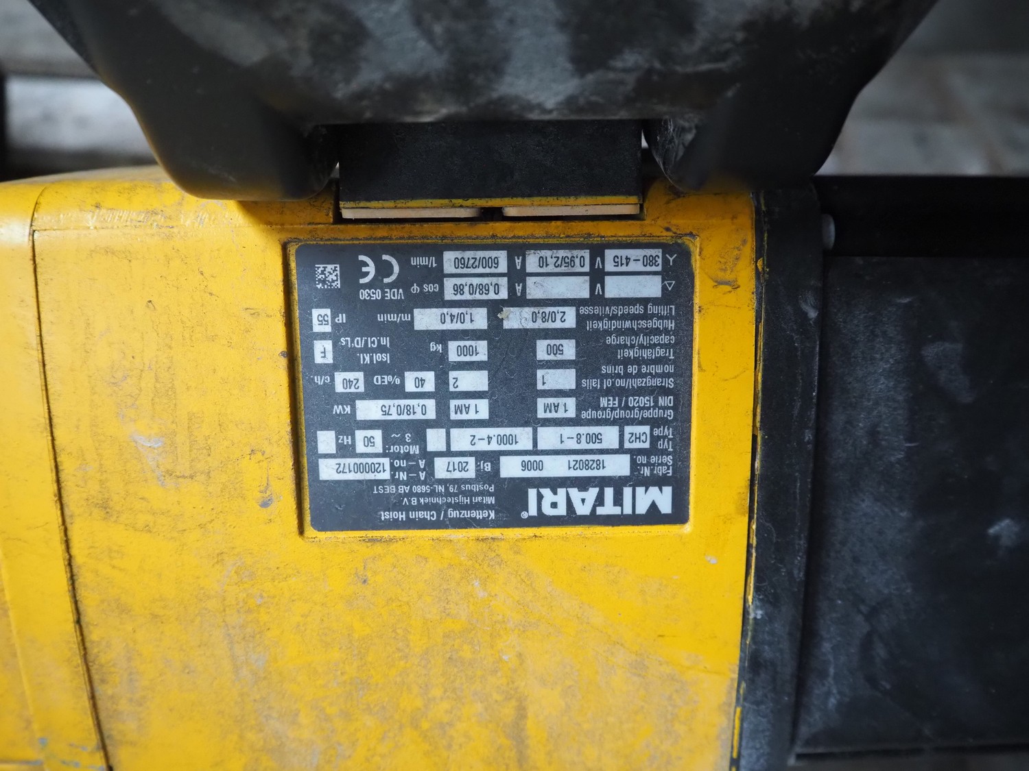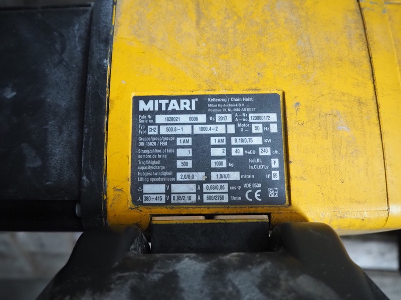 Mitari chain hoist, type: CH2 500.8-1 1000.4-2, serial number: 1828021 0006, year of construction: 2017, 380/415 V, 3 Ph, 50 Hz, 0.95/2.10 A, 0.18/0.75 kW, capacity: 500/1000 kg, dimensions: 370 mm x 320 mm x 400 mm.