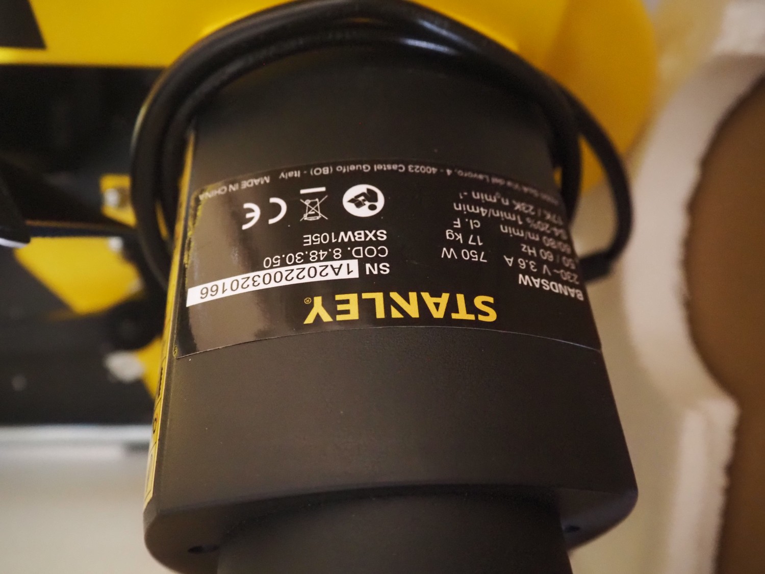 Stanley bandsaw, serial number: 1A202200320166, 230 V, 50/60 Hz, 3.6 A, 750 W, dimensions: 740 mm x 400 mm x 500 mm.