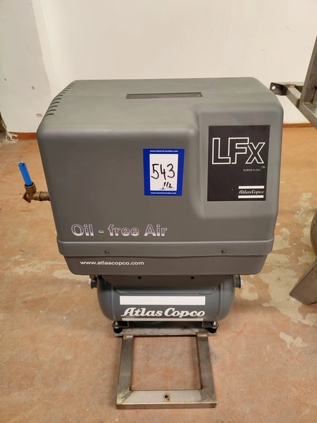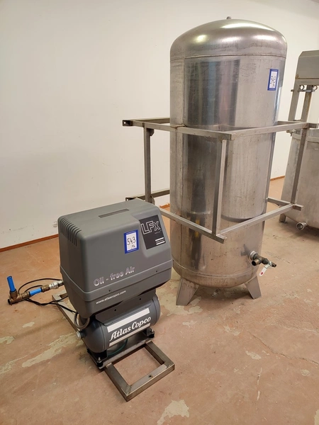 Atlas Copco air compressor with receiver, type: LFX0.7-10TR 20, serial number: ITR1348576, year of construction: 2019, 230 V, 1 PH, 50 Hz, 0.53 kW, weight: 46 kg, max. pressure 10 bar, compressor dimensions: 800 mm x 1030 mm x 850 mm, Kaukora s/s receiver, type: PVS-500, serial number: 160961, year of construction: 2000, volume: 500 dm³, max 10 bar, receiver dimensions: 800 mm x 980 mm x 1800 mm.