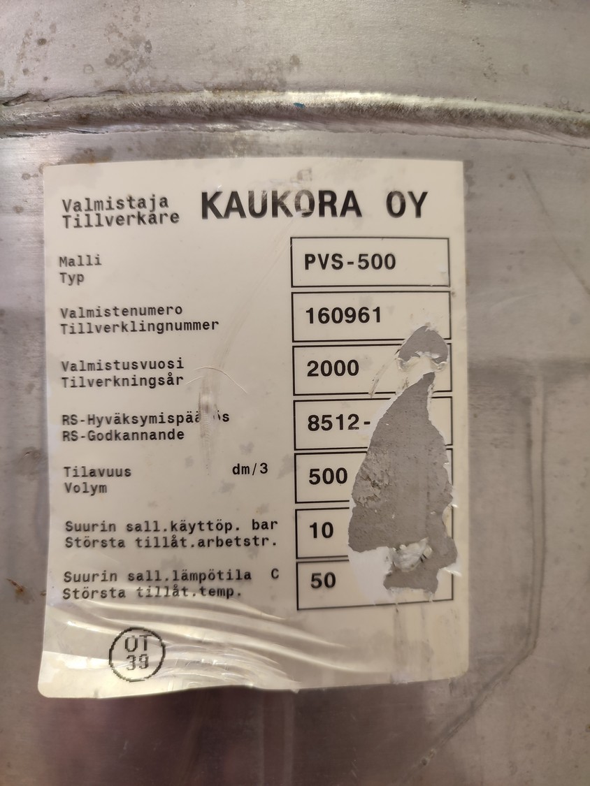Atlas Copco air compressor with receiver, type: LFX0.7-10TR 20, serial number: ITR1348576, year of construction: 2019, 230 V, 1 PH, 50 Hz, 0.53 kW, weight: 46 kg, max. pressure 10 bar, compressor dimensions: 800 mm x 1030 mm x 850 mm, Kaukora s/s receiver, type: PVS-500, serial number: 160961, year of construction: 2000, volume: 500 dm³, max 10 bar, receiver dimensions: 800 mm x 980 mm x 1800 mm.