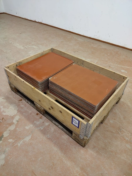 Wooden pallet box with large amount baking trays, approximately 150 pieces, baking tray dimensions: 450 mm x 600 mm, total dimensions: 1200 mm x 800 mm x 340 mm.