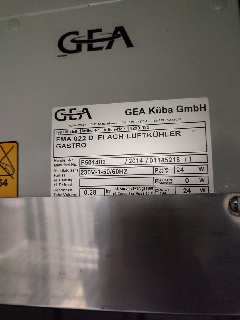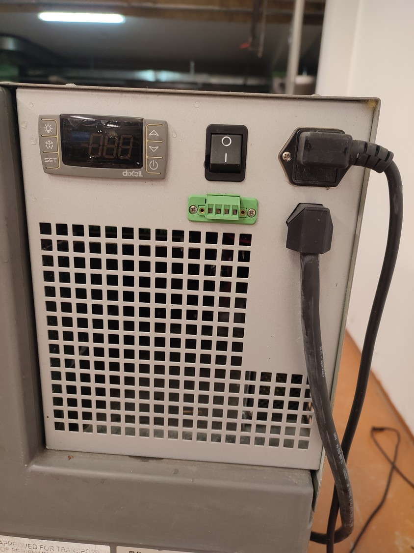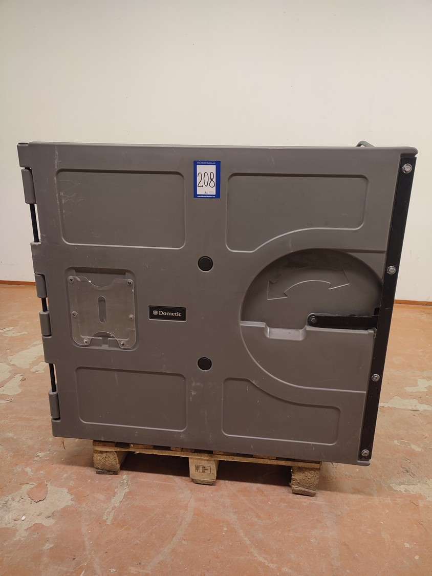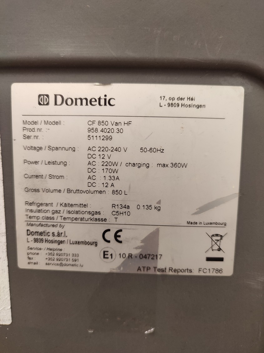 Dometic refrigerated container, model: CF 850 Van HF, serial number: 5111299, 220-240 V, 50-60 Hz, 1.33 A, 360 W, refrigerant: R314a, 135 gram, volume: 850 liter, dimensions: 1100 mm x 1400 mm x 1000 mm.