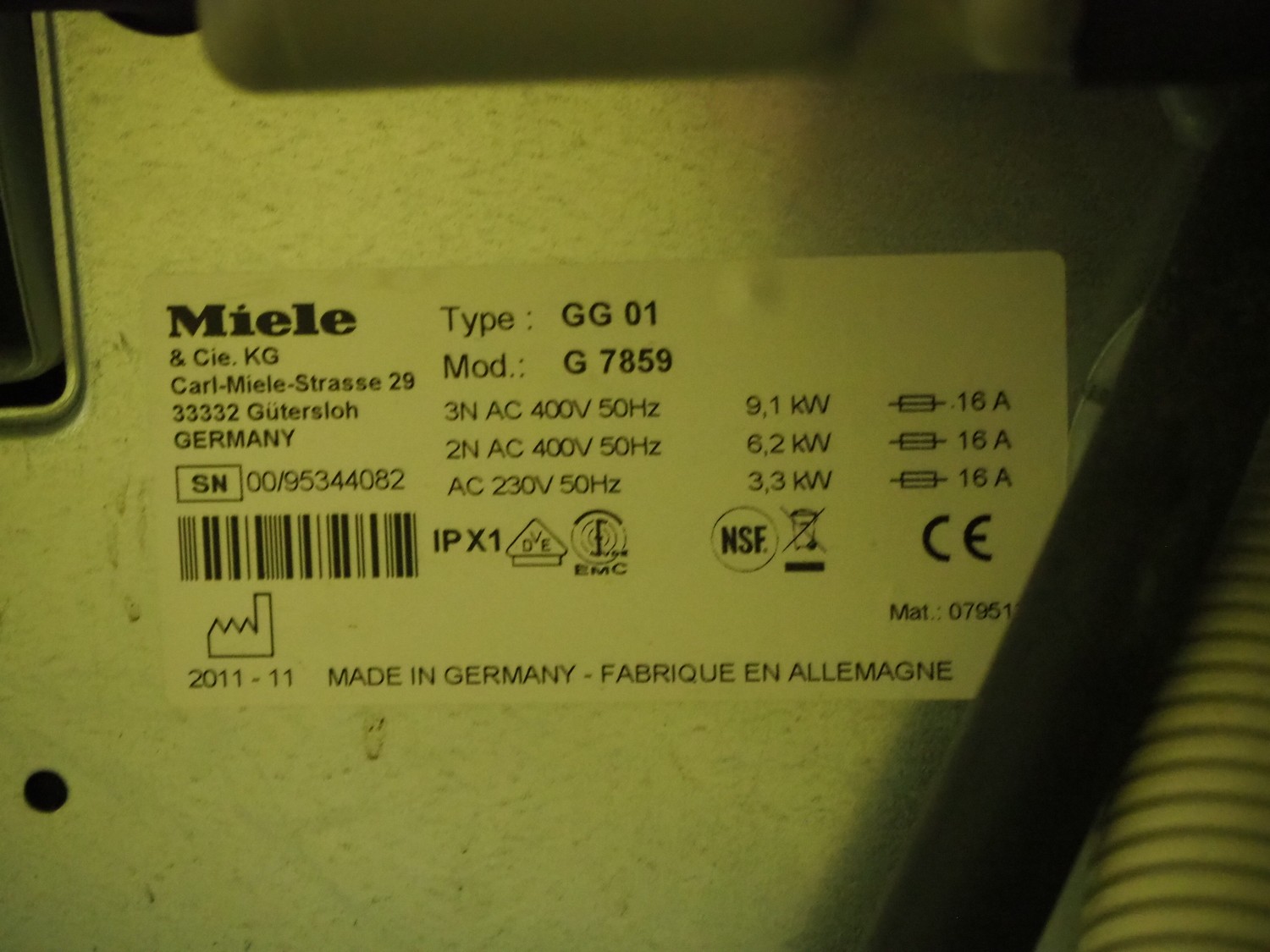 Miele dishwasher, type: GG 01, model: G 7859, serial number: 07951340, year of construction: 2011-11, 400 V, 3 Ph, 50 Hz, 16 A, 9.1 kW, dimensions: 640 mm x 600 mm x 1150 mm.