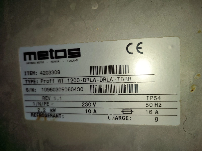 Metos heated counter, type: Proff WT-1200-DRLW-DRLW-TDRR, serial number: 10960305060430, 230 V, 50 Hz, 2.2 kW, 10 A, dimensions: 1200 mm x 720 mm x 930 mm.