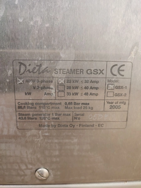Dieta gentle pressure steamer, model GSX-1, serial number 050812, year of construction: 2005, 400 V, 3 Ph, 22 kW, 32 A, 6 floors, dimensions floors 540 mm x 320 mm, total dimensions: 605 mm x 855 mm x 1380 mm.