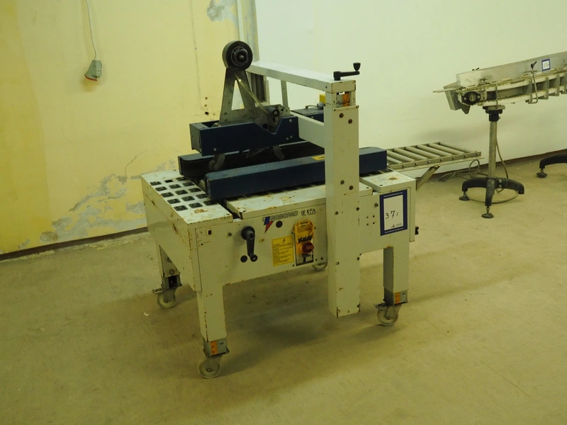 Robopac mobile box closing machine, model: ROBOTAPE 50 M, serial number: KN/049732, year of construction: 04/2002, 400 V, 3 Ph, 50 Hz, 1.6 A, 0.6 kW, weight: 144 kg, plastic belt, belt width: (2x) 80 mm, s/s rollers, roller width: 285 mm, total dimensions: 1650 mm x 1030 mm x 1420 mm. Missing taper.