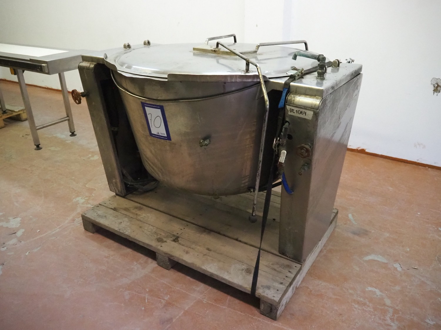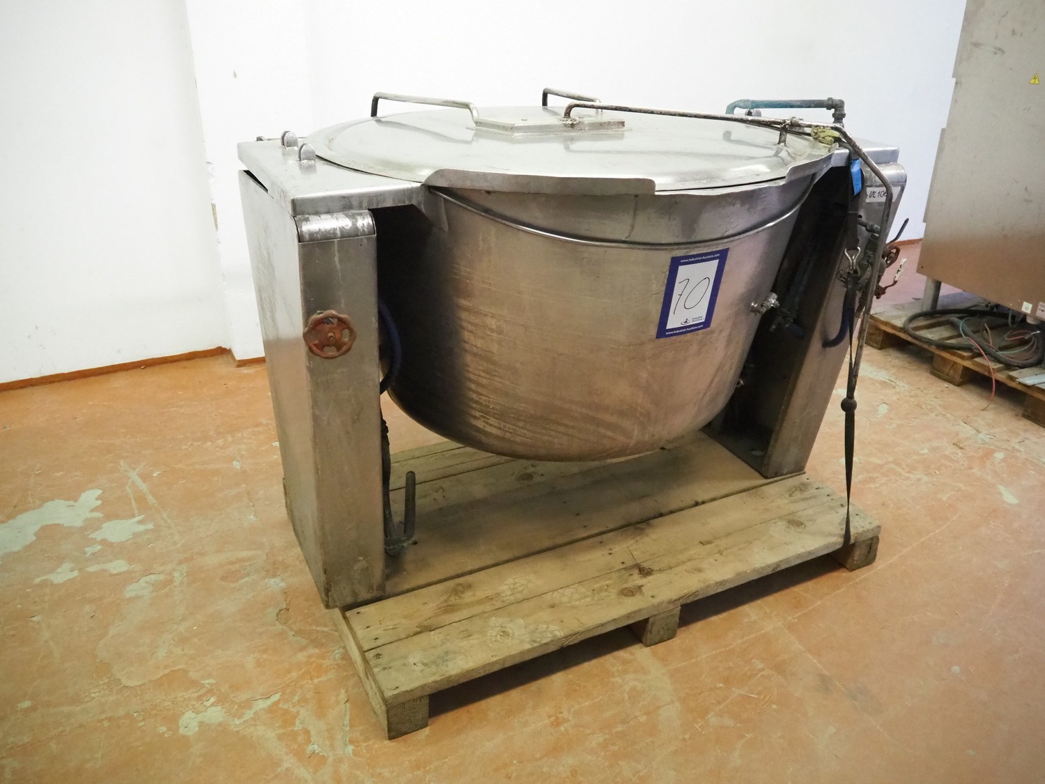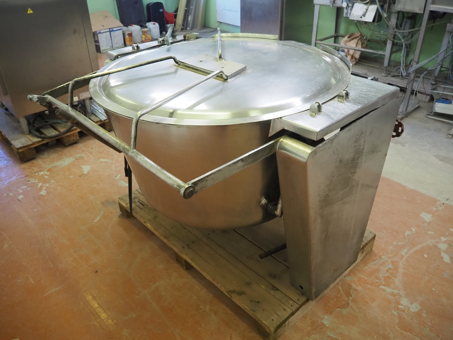 Tiltable cooking vessel, inside dimensions: Ø 1170 mm x 650 mm, total dimensions: 1550 mm x 1450 mm x 1100 mm.
