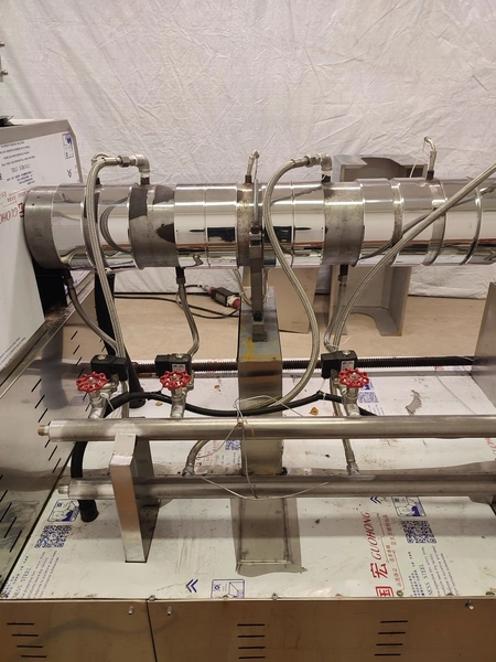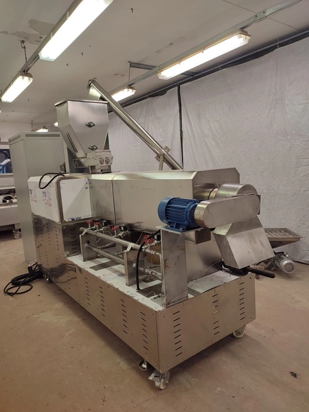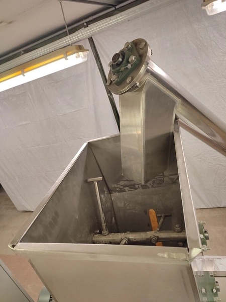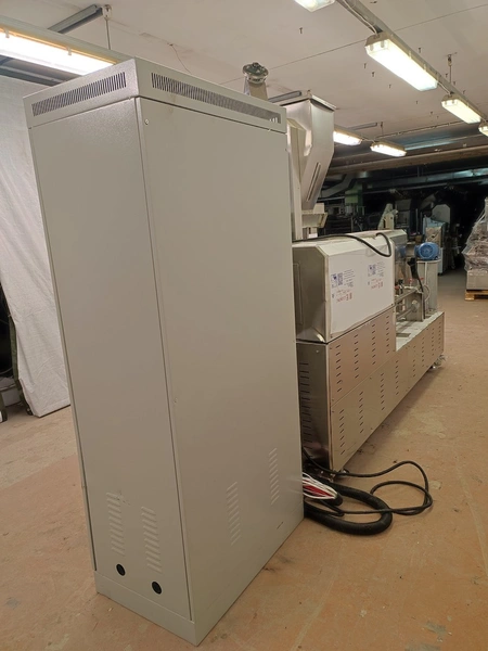 Mobile single screw extruder with elevating screw, model: DXY2000, dimensions extruder: 3000 mm x 950 mm x 2200 mm, dimensions elevating screw: 2800 mm x 600 mm x 2500 mm, dimensions switch cabinet: 855 mm x 560 mm x 1955 mm.