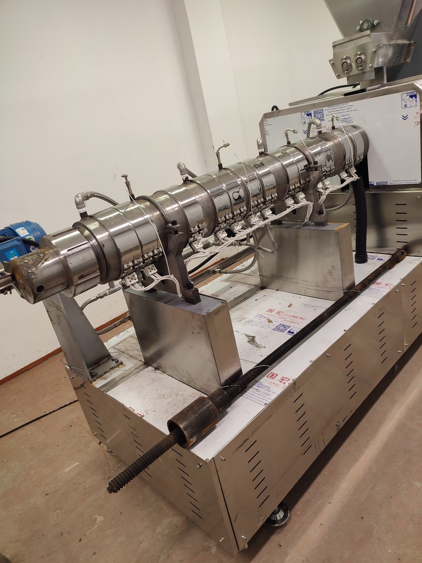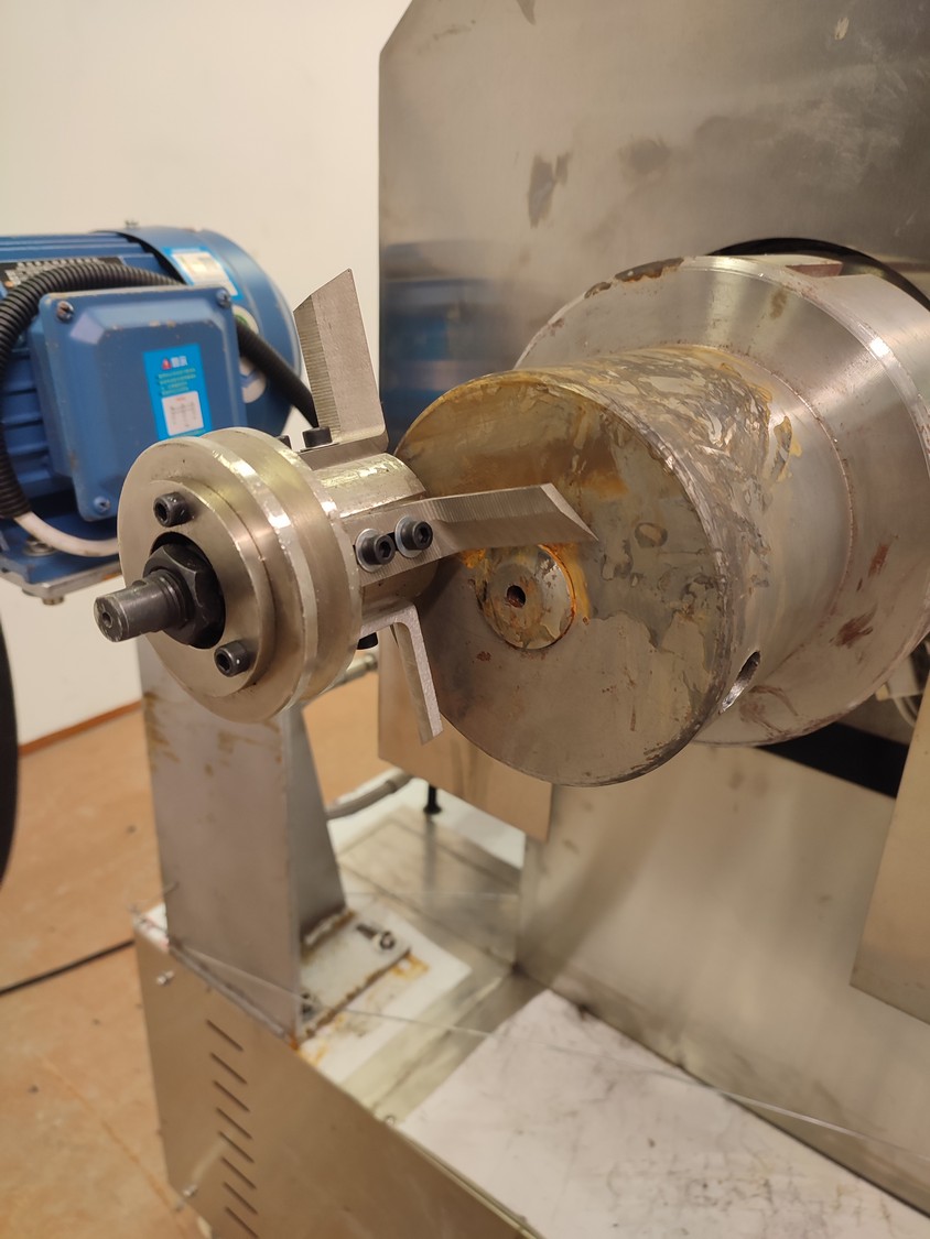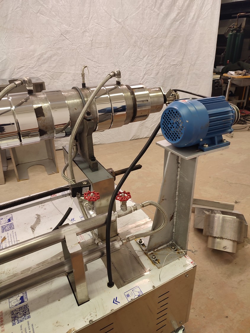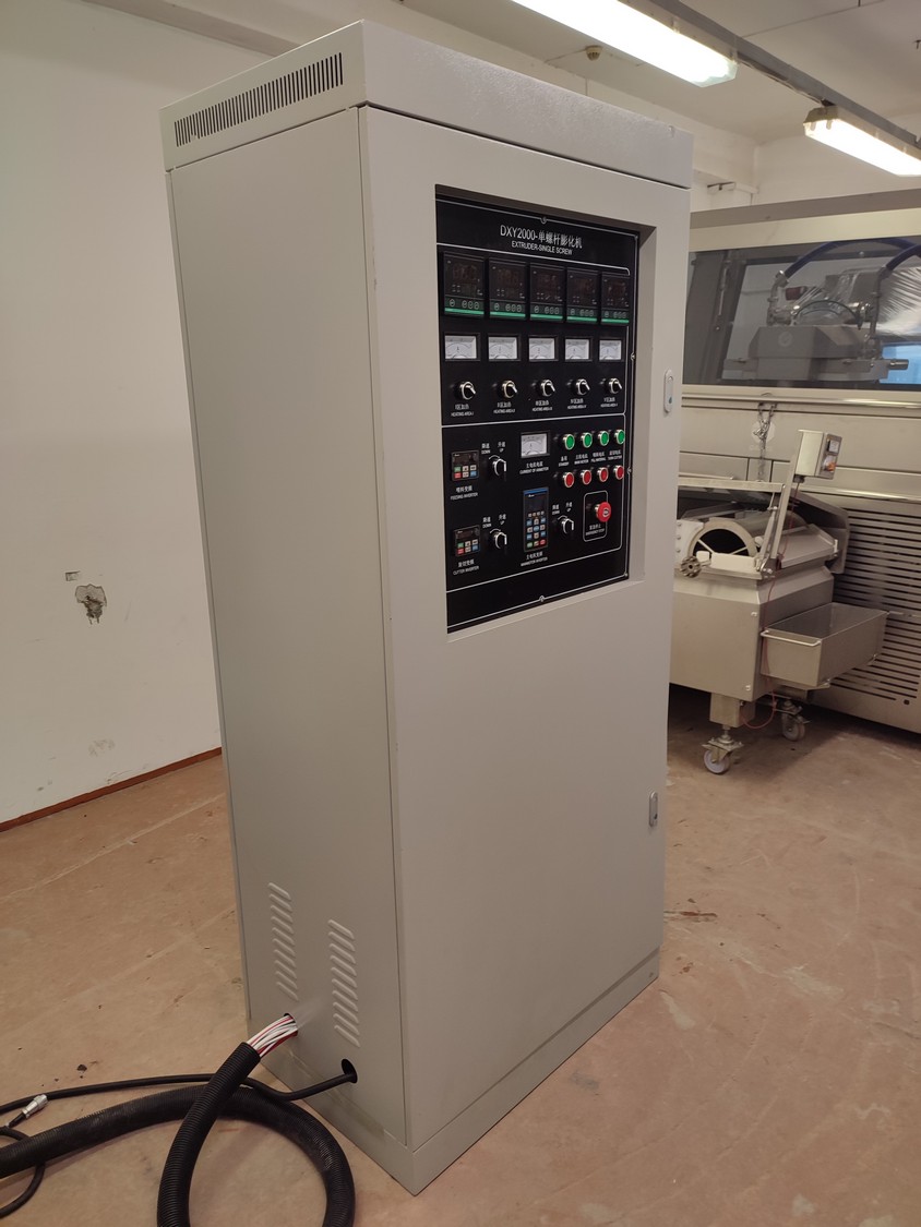 Mobile single screw extruder with elevating screw, model: DXY2000, dimensions extruder: 3000 mm x 950 mm x 2200 mm, dimensions elevating screw: 2800 mm x 600 mm x 2500 mm, dimensions switch cabinet: 855 mm x 560 mm x 1955 mm.
