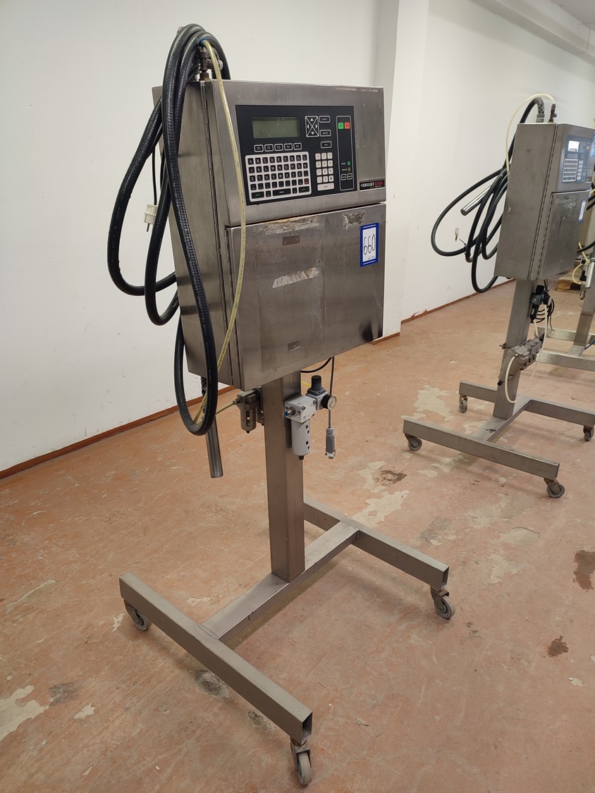 Videojet mobile inkjet printer, model: EXCEL/170i, serial number: 001520029WD, 100-240 V, 1 Ph, 50/60 Hz, 2-1 A, dimensions: 750 mm x 750 mm x 1650 mm.