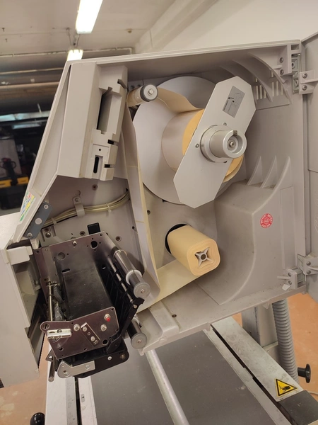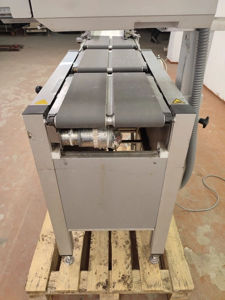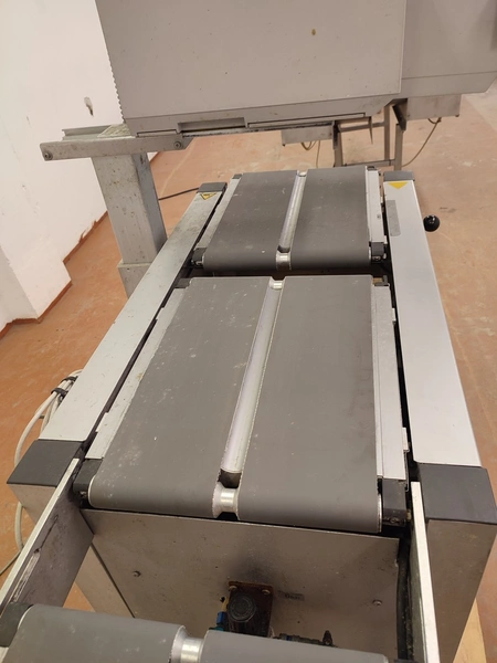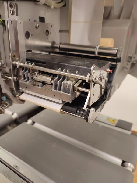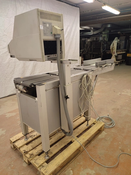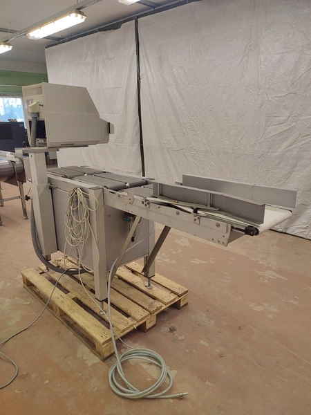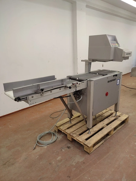Bizerba checkweigher with labeller, model labeller: Bizerba-GV, number: 10467212, 230 V, 50 Hz, 1.7 A, belt width: (3x) 135 mm and (1x) 290 mm, total dimensions: 1920 mm x 820 mm x 1480 mm.