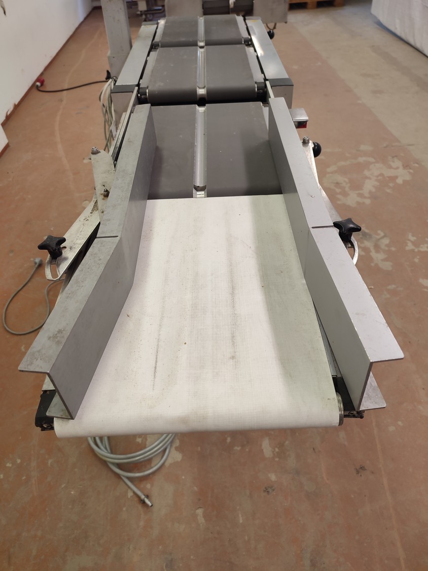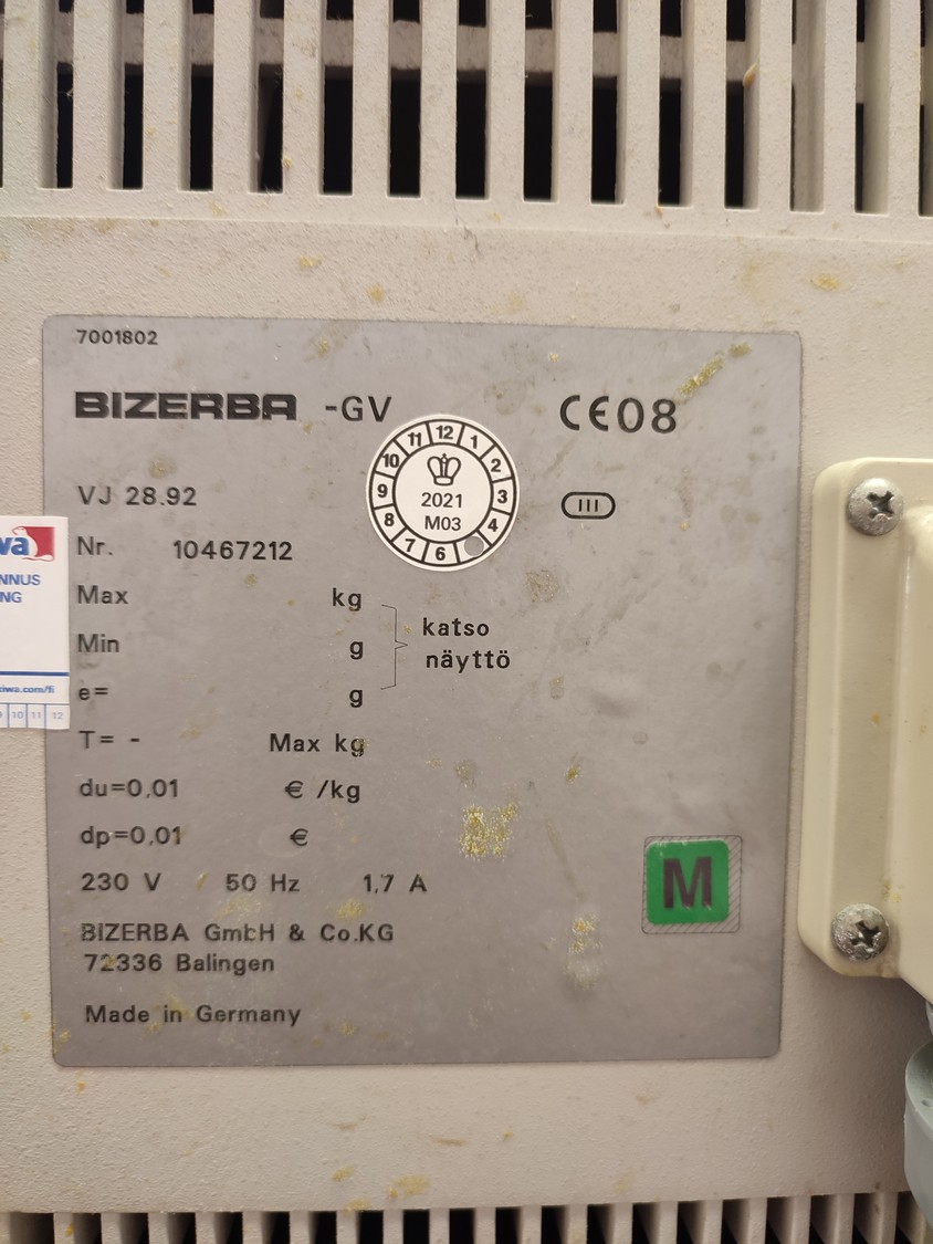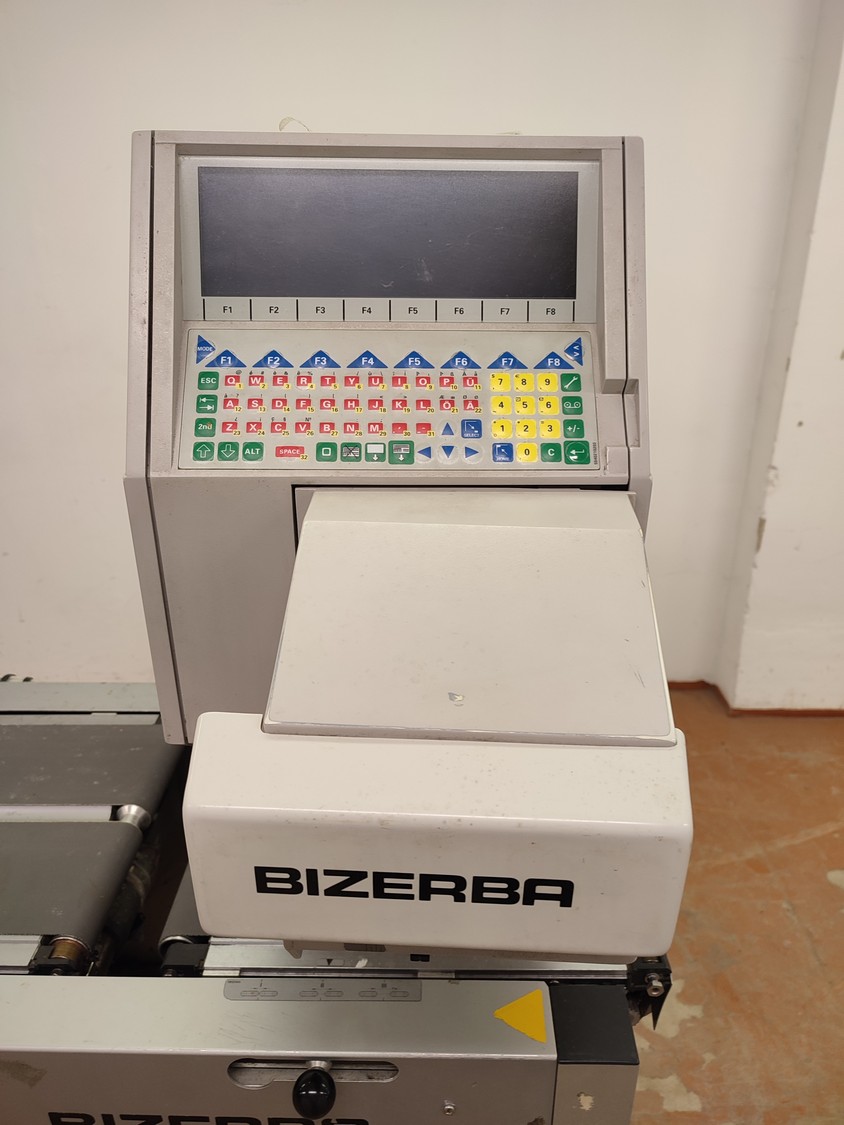 Bizerba checkweigher with labeller, model labeller: Bizerba-GV, number: 10467212, 230 V, 50 Hz, 1.7 A, belt width: (3x) 135 mm and (1x) 290 mm, total dimensions: 1920 mm x 820 mm x 1480 mm.