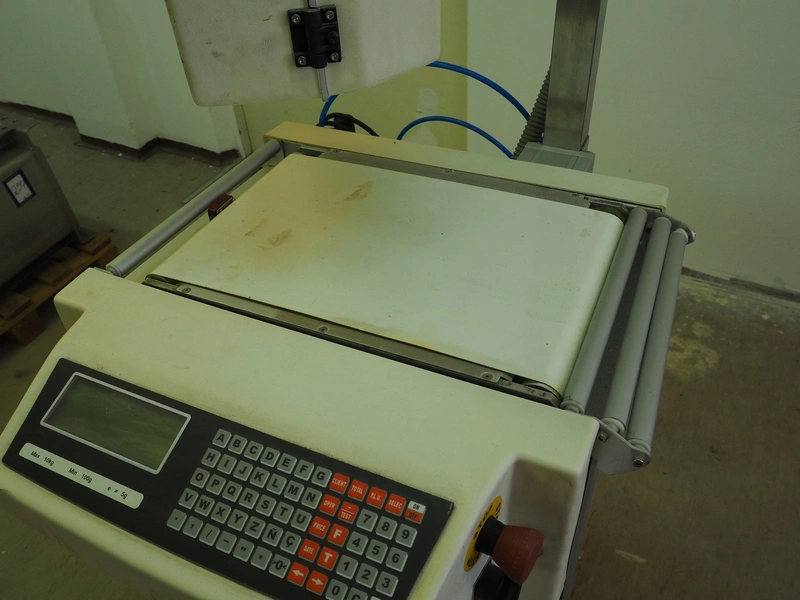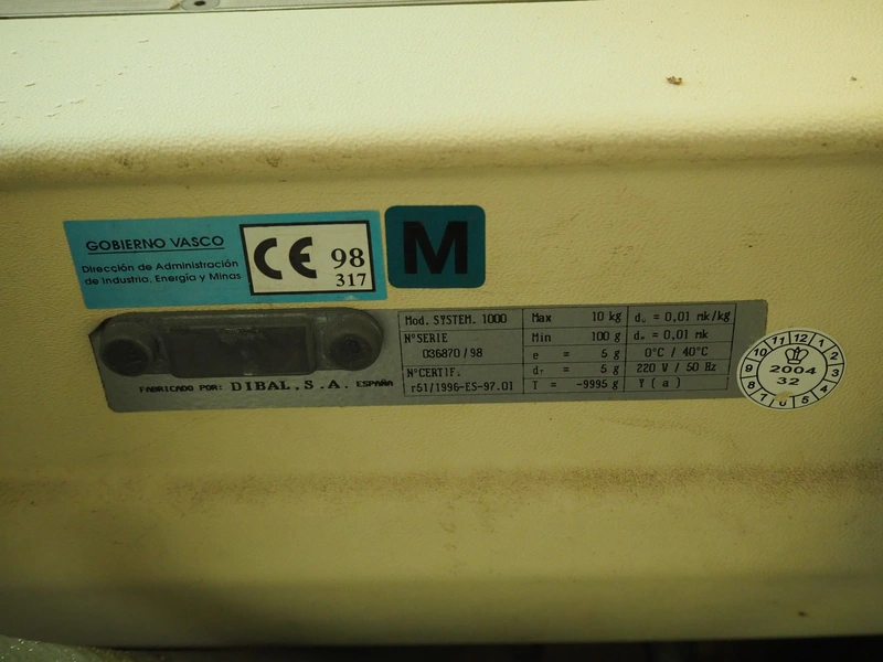 Dibal weighing and labelling machine, labeller model: PEA 1000, weigher model: System 1000, serial number: 036870/98, year of construction: 1998, maximum weight: 10 kg, minimum weight: 100 gram, e= 5 gram, 220 V, 50 Hz, plastic belt, belt width: 275 mm, total dimensions: 600 mm x 700 mm x 1700 mm.