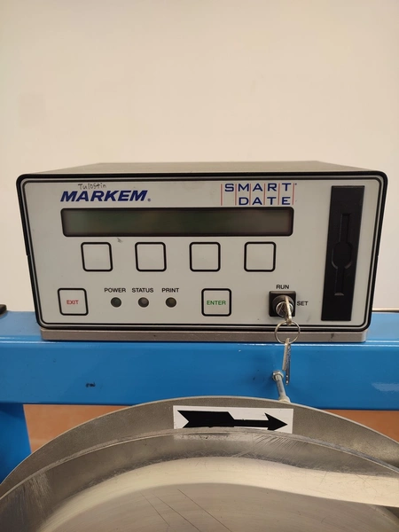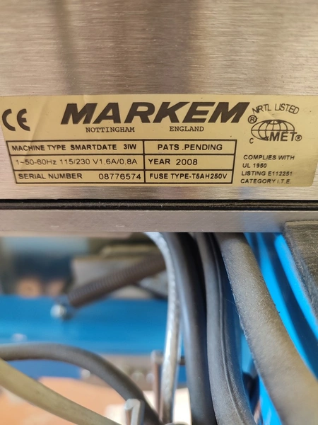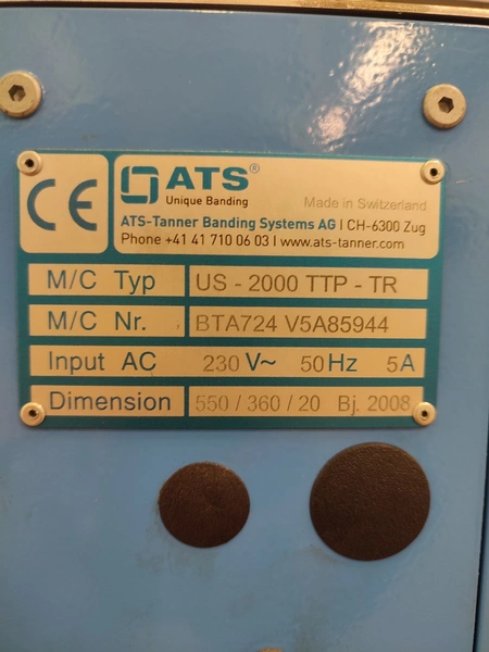 ATS binding machine with printer, type: US-2000 TTR-TR, number: BTA724 V5A85944, year of construction: 2008, 230 V, 1 Ph, 50 Hz, 5 A, Markem printer type: SMARTDATE 3IM, serial number: 08776574, year of construction: 2008, 115/230 V, 1 Ph, 50-60 Hz, 1.6/0.8 A, total dimensions: 1900 mm x 900 mm x 1330 mm.
