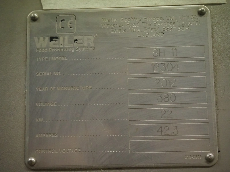 Weiler Beehive Europe, Ltd grinder, type: SH 11, serial number: 12304, year of construction: 2012, 280 V, 22 kW, 42.3 A, plate diameter : 280 mm, dimensions grinder: 920 mm x 1000 mm x 1500 mm, dimensions switch cabinet: 800 mm x 310 mm x 1000 mm. Incomplete.