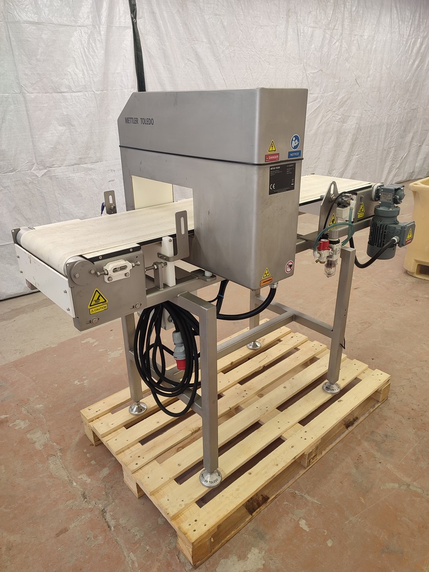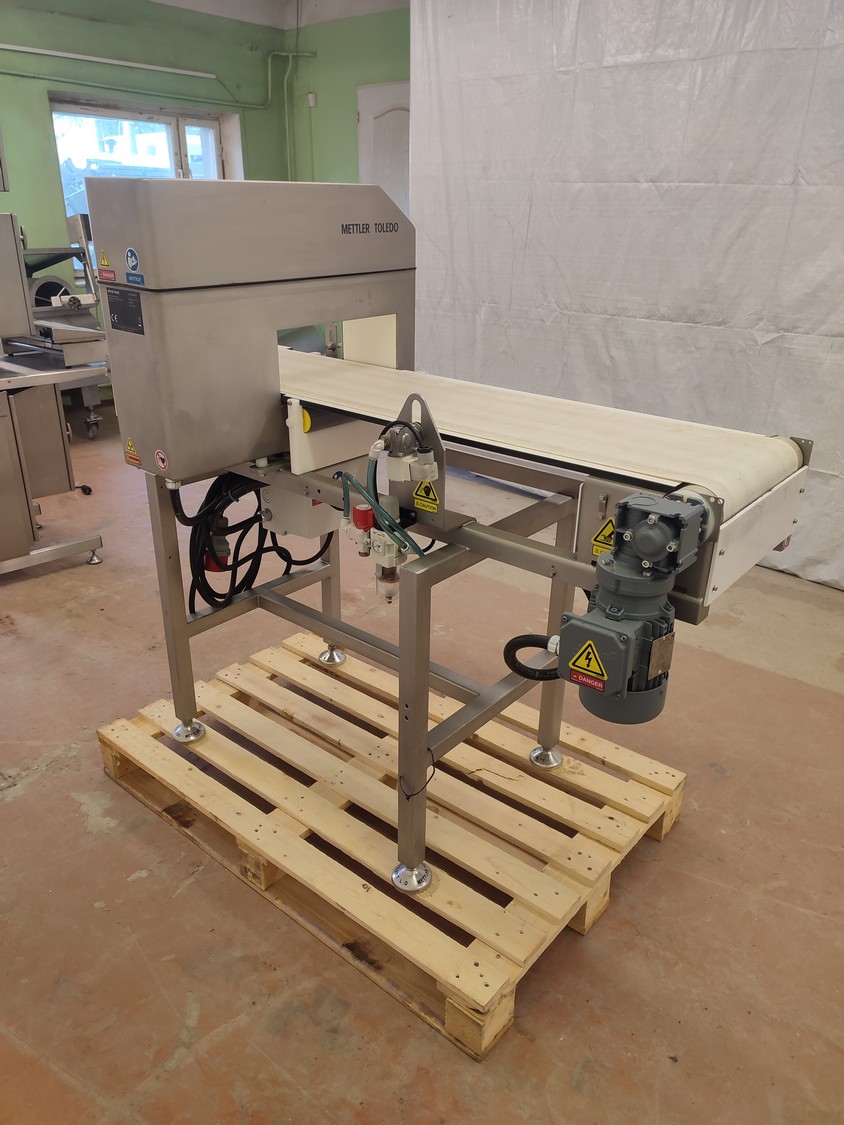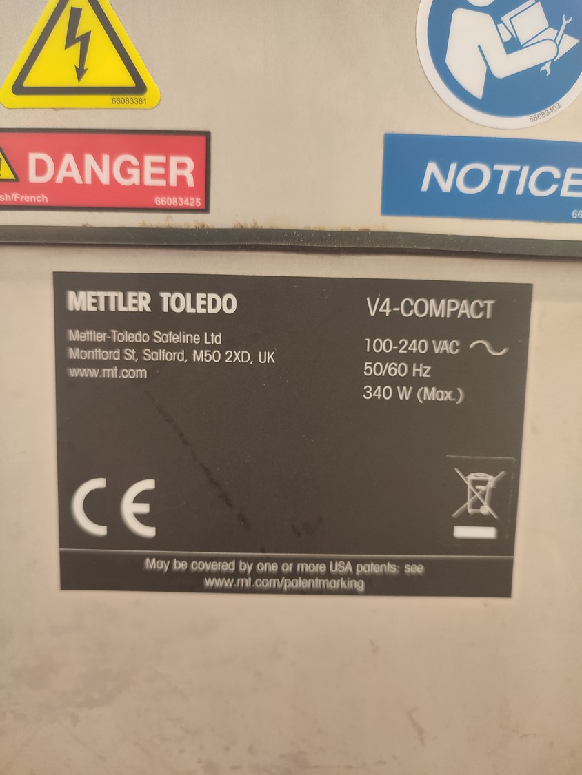 Mettler Toledo Safeline Ltd metal detector with rejector, model: V4-COMPACT, 100/240 V, 50/60 Hz, 340 W, plastic belt, belt width: 315 mm, clearance: 350 mm x 120 mm, total dimensions: 1530 mm x 720 mm x 1250 mm.