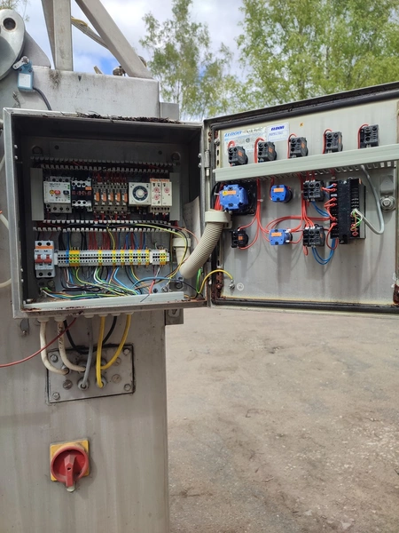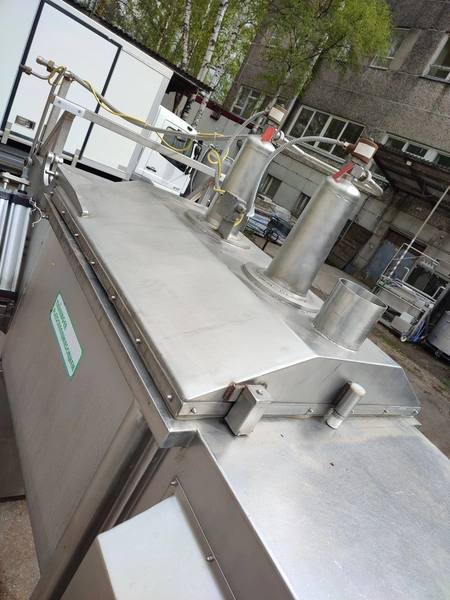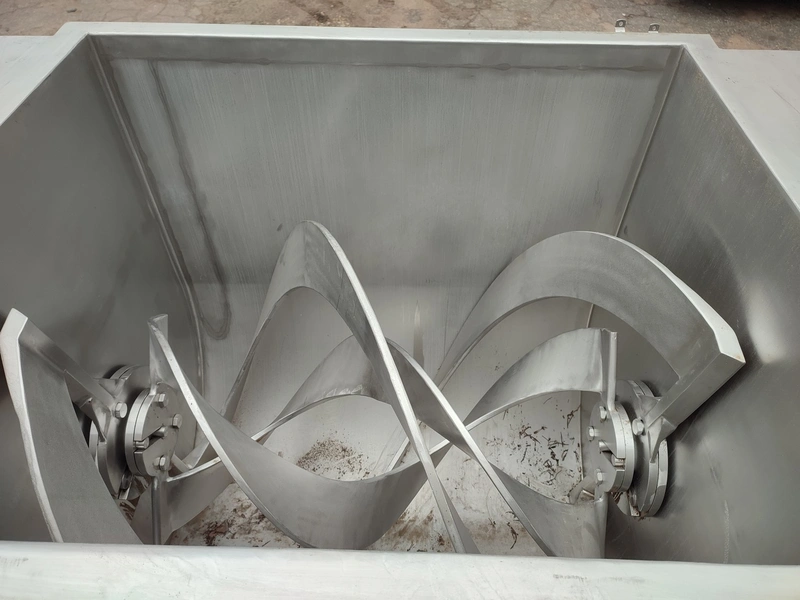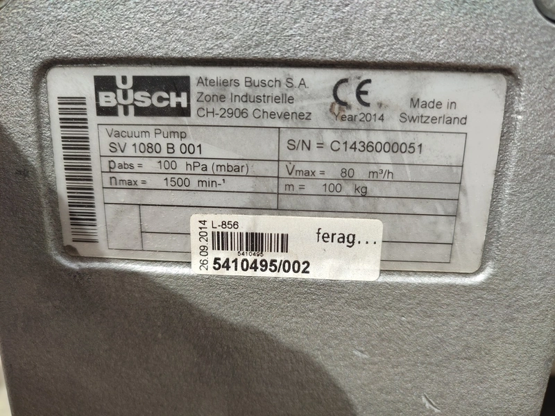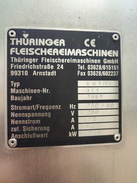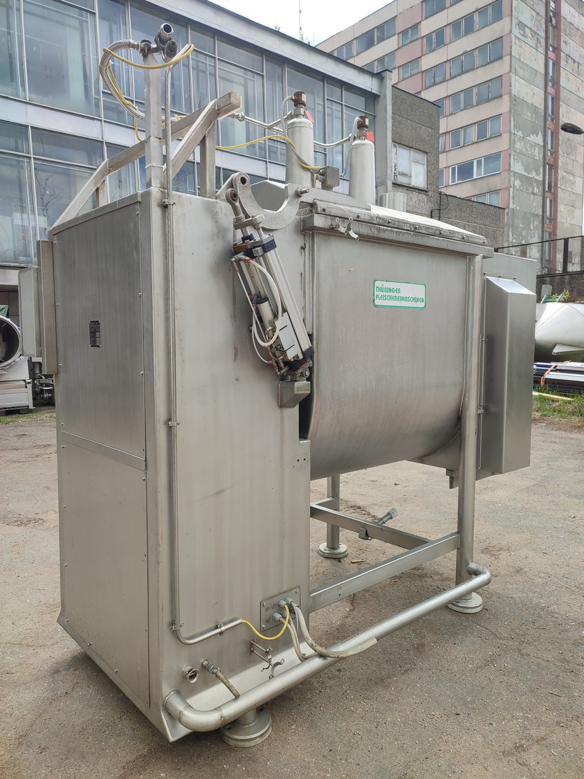 Thuringer Fleischereimaschinen GmbH spiral vacuum mixer, type: VM 1000, machine number: 021, year of construction: 1997, 380 V, 3 Ph, 50 Hz, 28 A, 12.5 kW, Busch vacuum pump, type: SV 1080 B 001, serial number: C1436000051, year of construction: 2014, capacity: 80 m³ per hour, mixer dimensions: 2700 mm x 1440 mm x 2700 mm, vacuum pump dimensions: 930 mm x 680 mm x 750 mm.