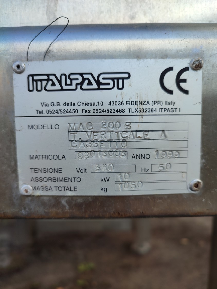 Italpast pasta extruder, model: MAC 200 S, serial number: 99013003, year of construction: 1999, 380 V, 50 Hz, 10 kW, weight: 1050 kg, dimensions: 1140 mm x 2350 mm x 2220 mm.