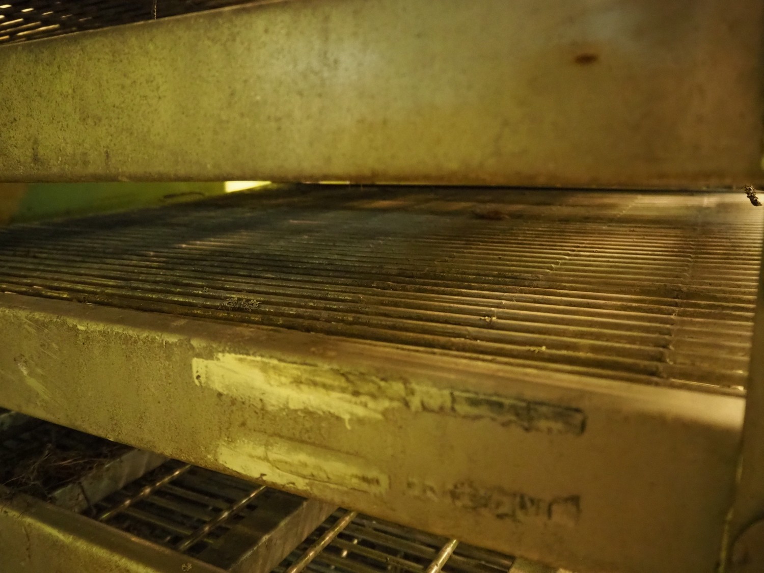 2 s/s meat presses, 10 floors, dimensions floors: (10x) 890 mm x 960 mm, distance between floors: 100 mm, total dimensions: (2x) 980 mm x 1000 mm x 1940 mm.