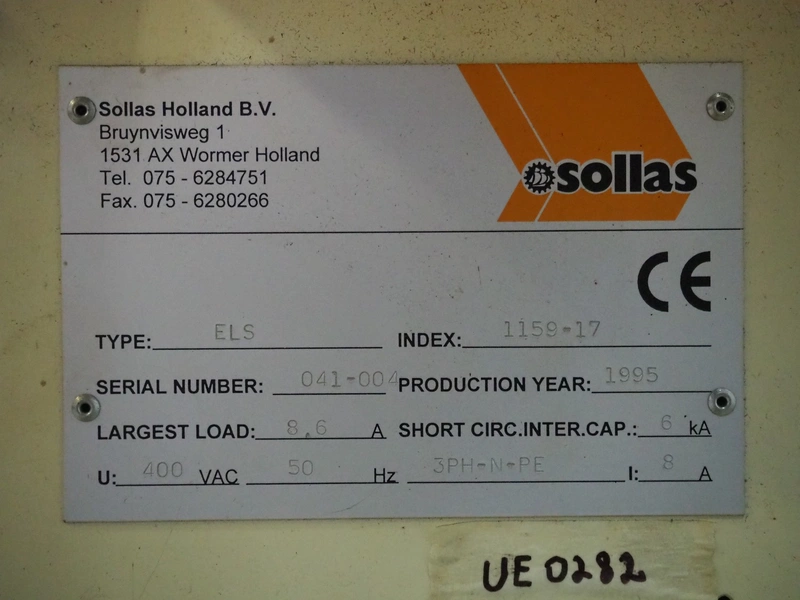 Sollas Holland B.V. shrink tunnel, type: ELS, serial number: 041-004, year of construction: 1995, 400 V, 3 Ph, 50 Hz, 8 A, plastic belt, belt width: (2x) 30 mm, adjustable clearance: max 100 mm x 100 mm, total dimensions: 1000 mm x 1100 mm x 1680 mm.