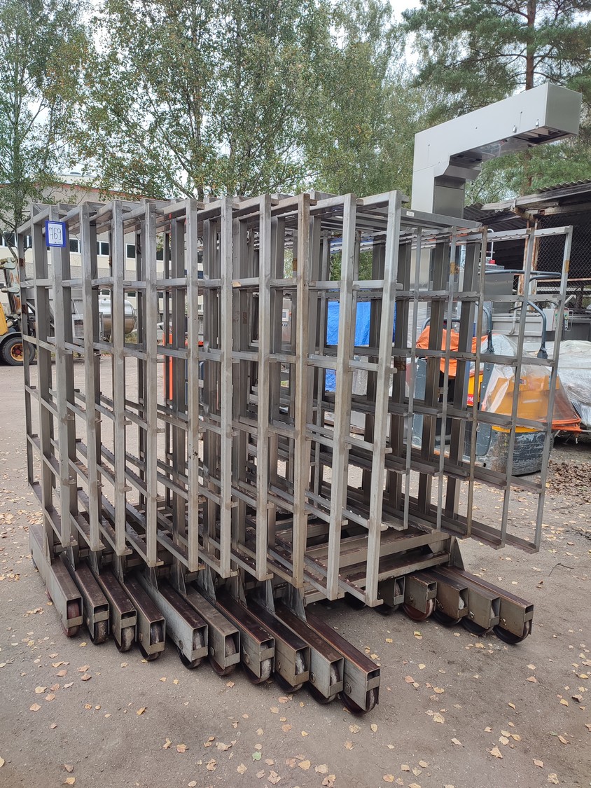 10 s/s smoke trolleys, 6 floors each, dimensions each floor: 1015 mm x 995 mm, total dimensions: (10x) 1020 mm x 1000 mm x 2000 mm.