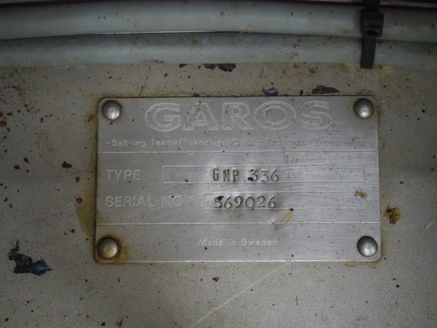 Garos tenderizer, type: GNP 336, serial number: 569026, plastic mesh belt, belt width: 320 mm, clearance: 340 mm x 200 mm, total dimensions: 1300 mm x 600 mm x 1940 mm.