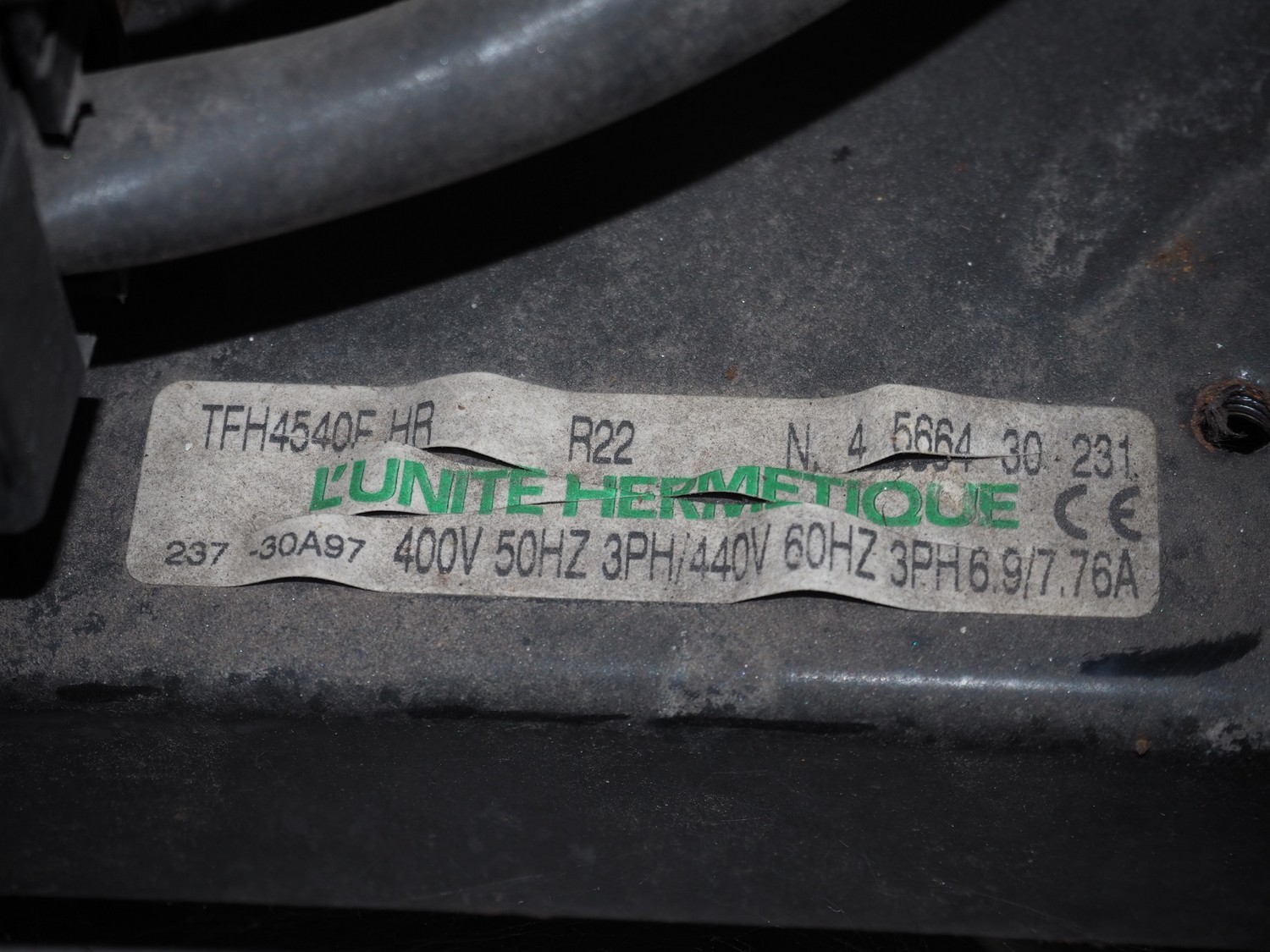 Inject Star cooling aggregate for tumblers with L'unite Hermetique cooling compressor, type: TFH4540F-HR, number: 4 664 30-231, refrigerant: R22, dimensions: 1200 mm x 800 mm x 1300 mm.