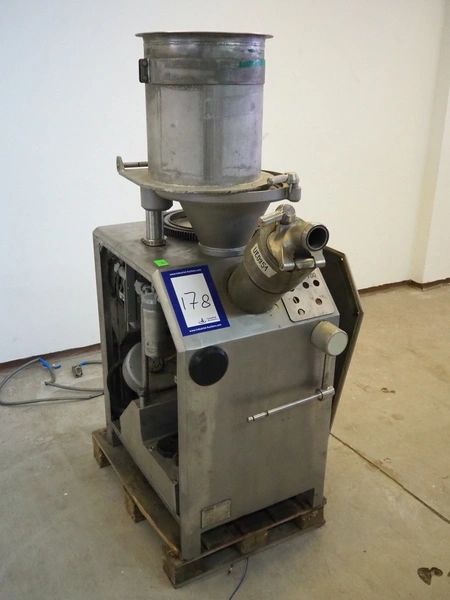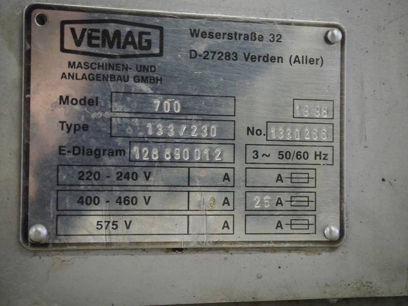 Vemag vacuum filling machine, model: 700, type: 133/230, number: 1330266, year of construction: 1998, 400/460 V, 13 A, dimensions: 860 mm x 560 mm x 1520 mm. Technical condition unknown, incomplete.