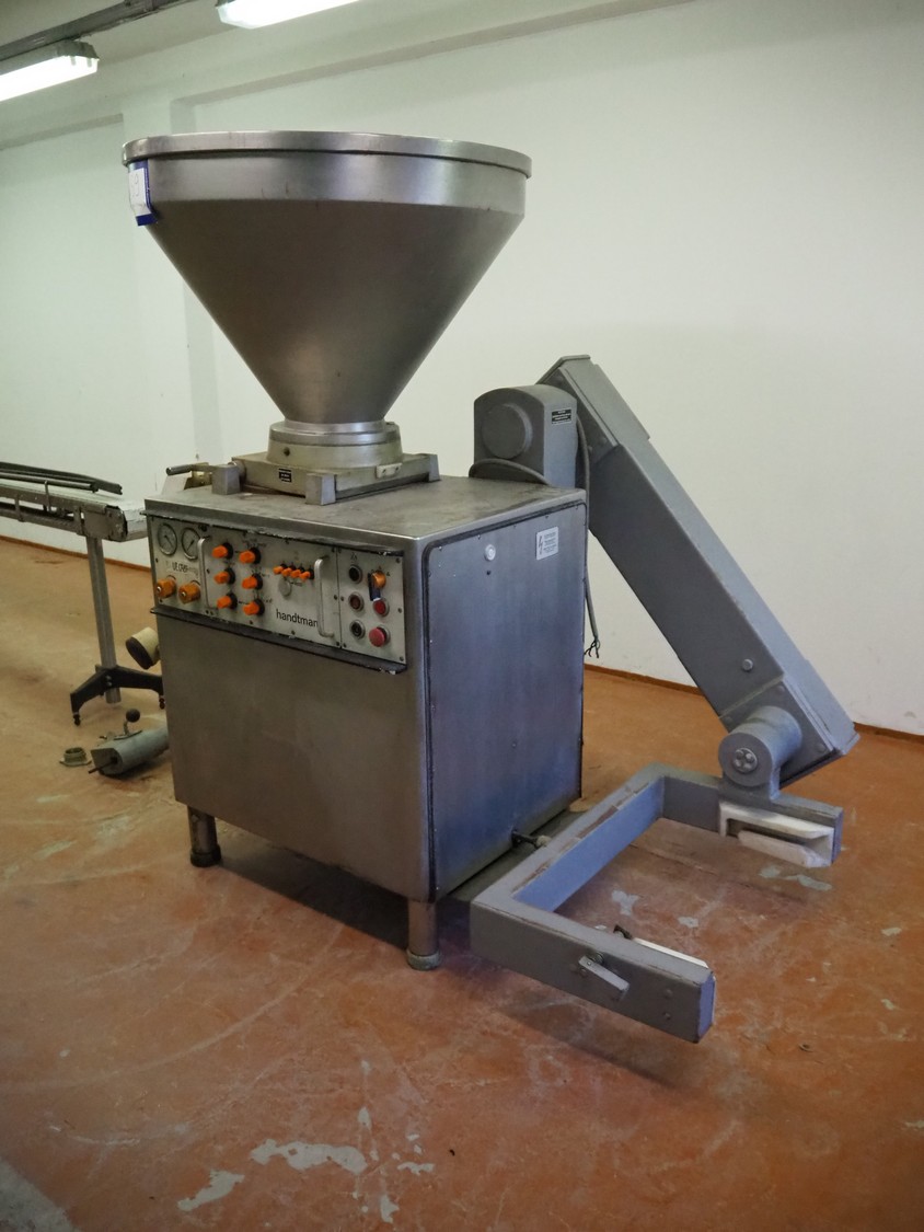Handtmann vacuum filling machine with lifter for 200 liter meat bins and linking attachment, model: VF20-300, number: 2644-1, model linking attachment: 34-2, number: 3869, dimensions: 1600 mm x 1300 mm x 1970 mm. Technical condition unknown.