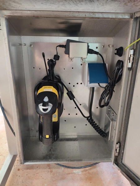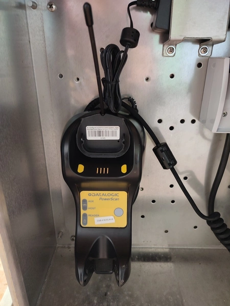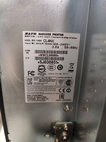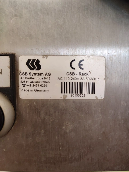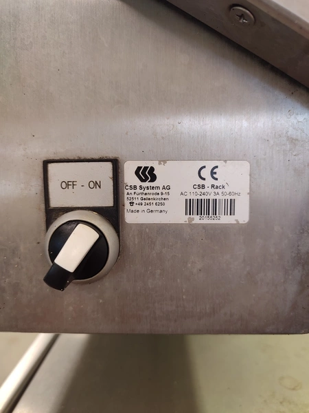CSB System AG industrial computer cabinet, 110/240 V, 50/60 Hz, SATO barcode printer, model: CL4NX, serial number: 5J030851, 100/240 V, 50/60 Hz, 3 A, Datalogic ADC Inc handheld bar code scanner, model: POWERSCAN M8300, serial number: E15L56692, year of construction: 30.10.2015, total dimensions: 700 mm x 950 mm x 1790 mm.