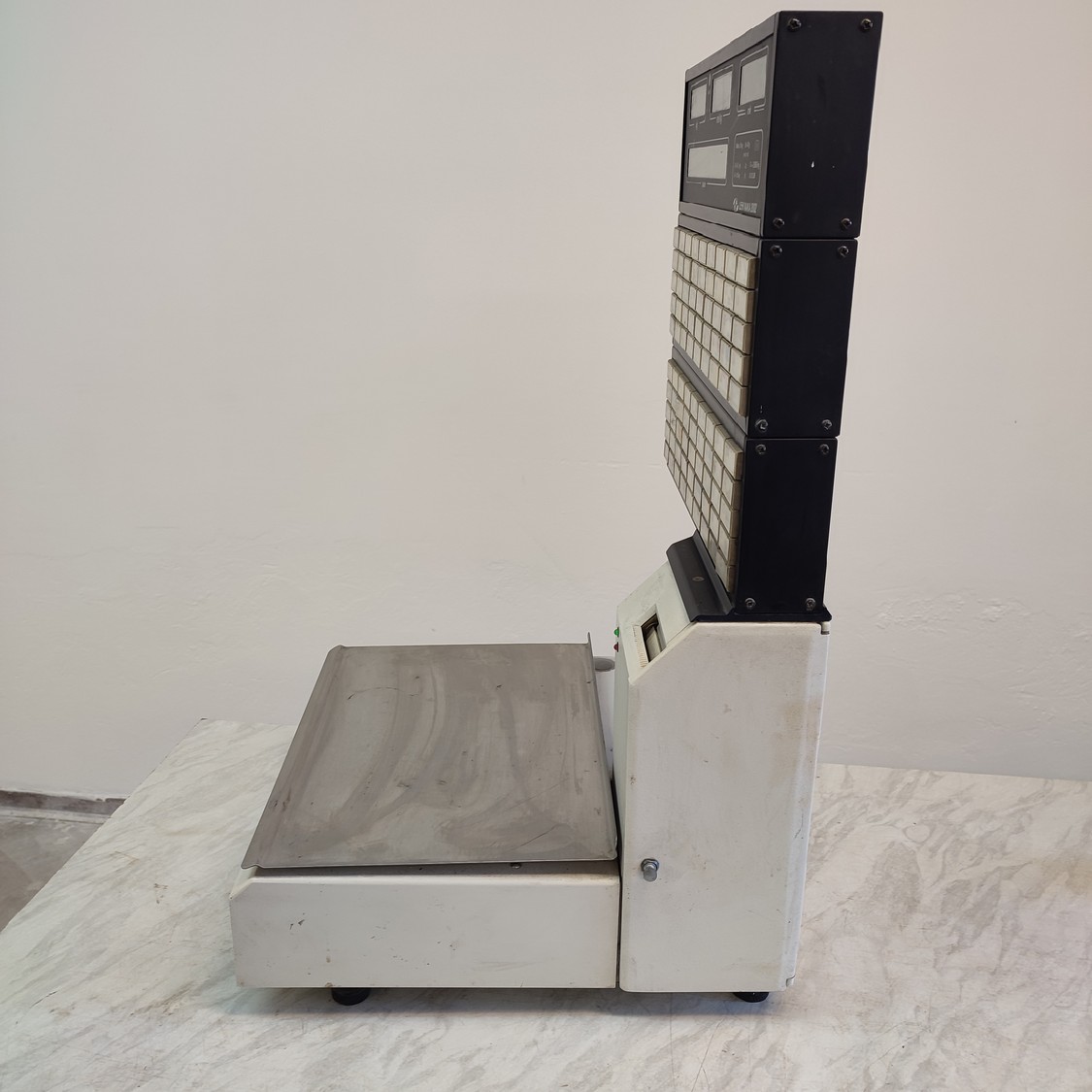 Lehikoinen Oy weighing scale with label printer, model: LEHI 2002 IP, serial number: 02629, 220 V, 50 Hz, 1.6 A, 65 W, maximum weight: 15 kg, minimum weight: 40 g, e= 2/5 g, T=-5.998 kg, dimensions scale: 365 mm x 270 mm, total dimensions: 415 mm x 380 mm x 685 mm.