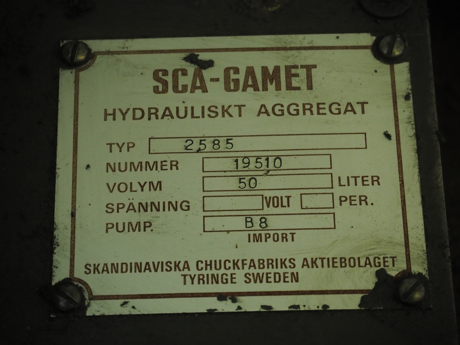 SCA-Gamet hydraulic unit, type: 2585, number: 19510, volume: 50 liter, dimensions: 460 mm x 400 mm x 700 mm.