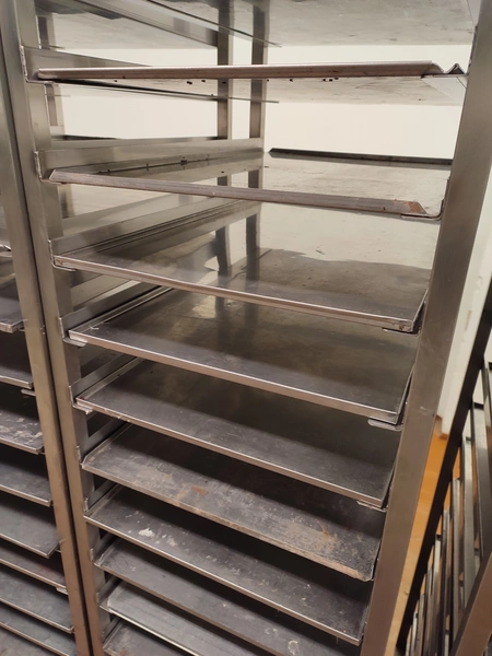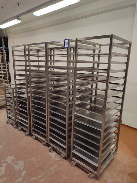 5 s/s trolleys, (1) x 8 floors, (4) x 17 floors, floor dimensions: 405 mm x 590 mm, distance between floors: 95 mm, total dimensions: (1) 450 mm x 600 mm x 940 mm; (4x) 460 mm x 595 mm x 1745 mm.