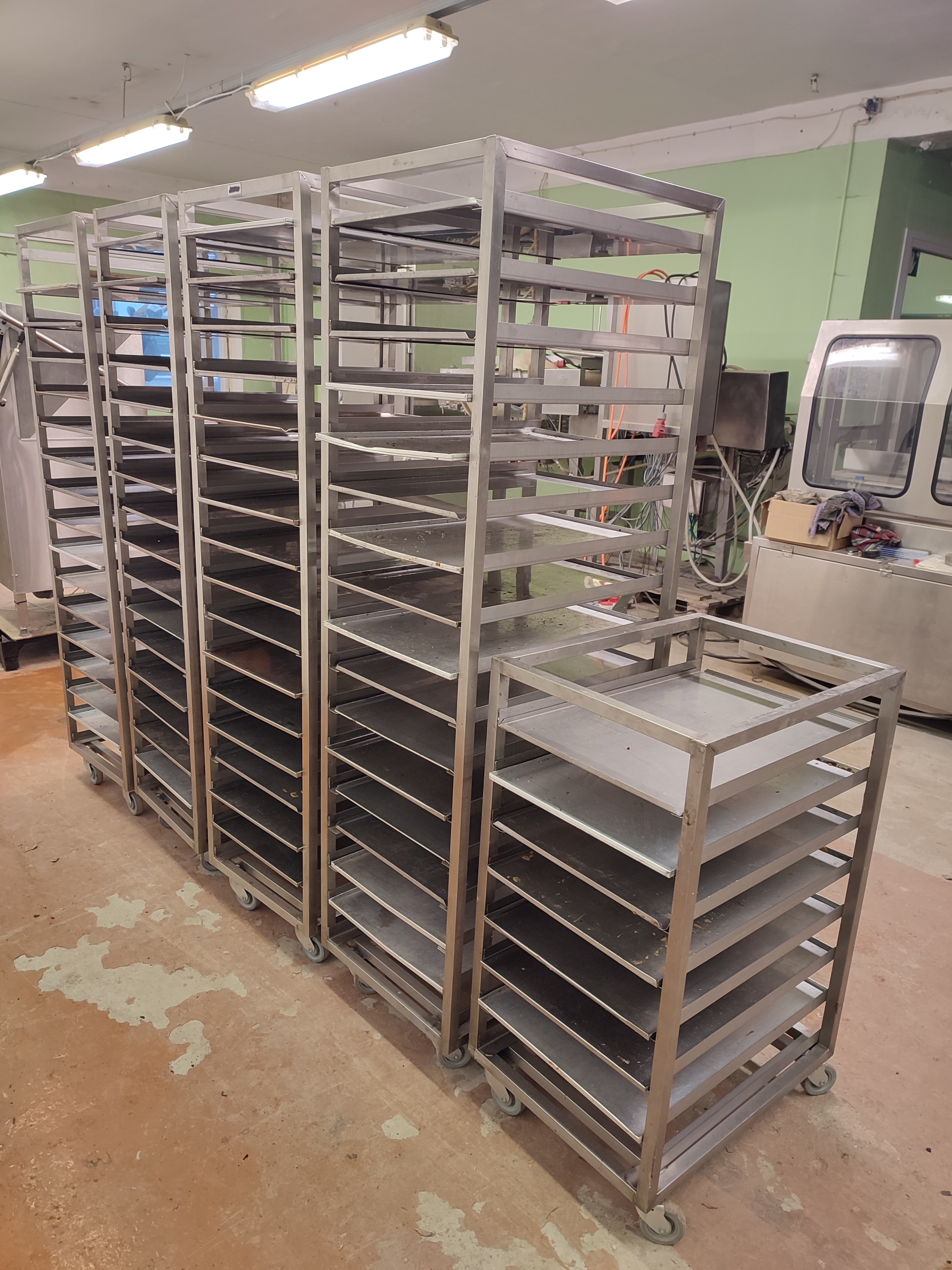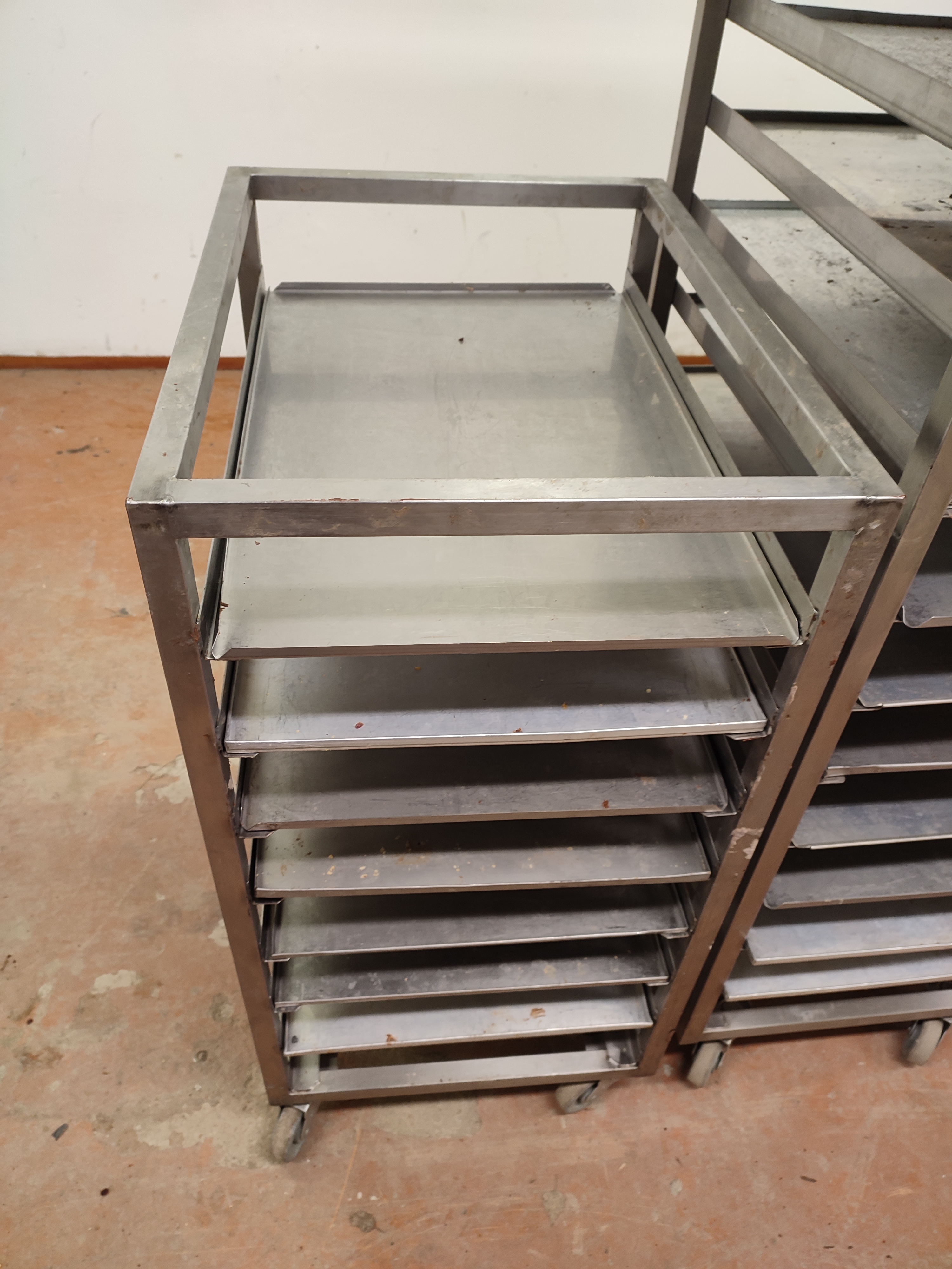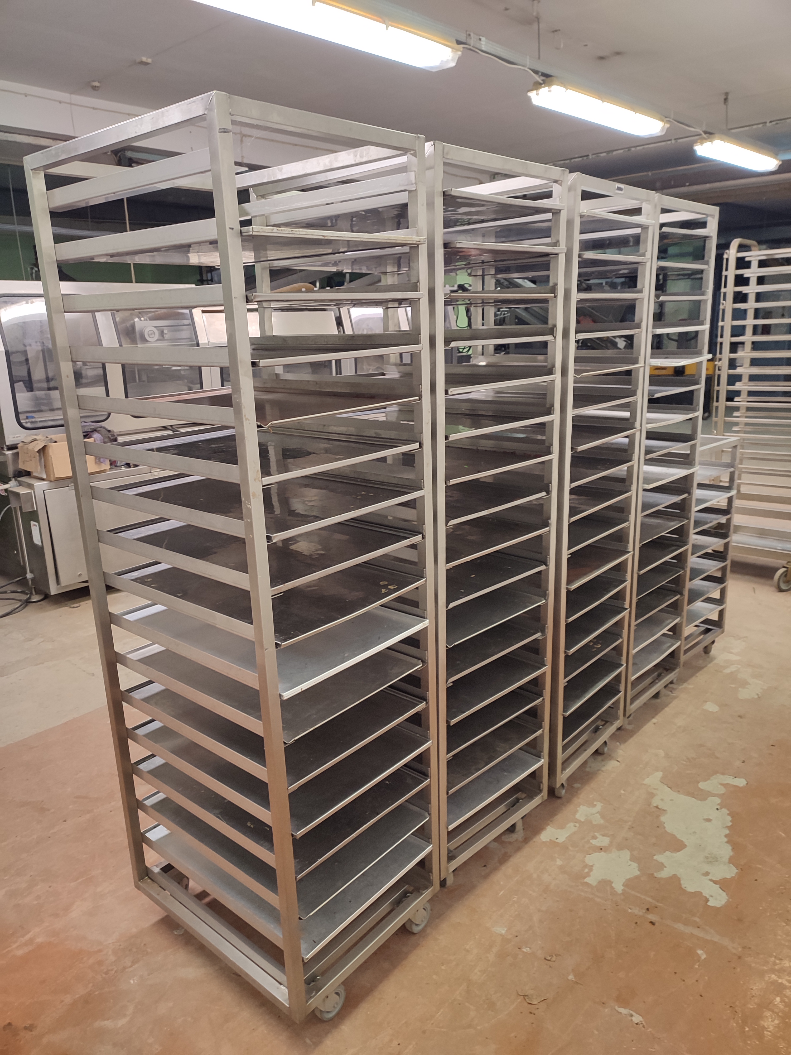 5 s/s trolleys, (1) x 8 floors, (4) x 17 floors, floor dimensions: 405 mm x 590 mm, distance between floors: 95 mm, total dimensions: (1) 450 mm x 600 mm x 940 mm; (4x) 460 mm x 595 mm x 1745 mm.