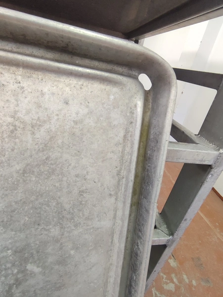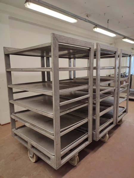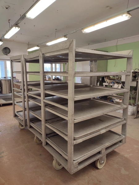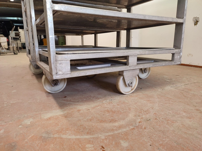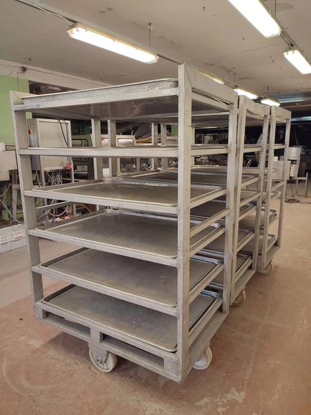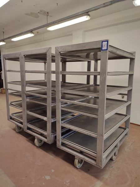 3 aluminum defrosting trolleys, (3) x 6 floors, floor dimensions: 805 mm x 1155 mm, distance between floors: 260 mm, with 18 baking trays, baking tray dimensions: 765 mm x 1110 mm, total dimensions: (3x) 805 mm x 1210 mm x 1780 mm.