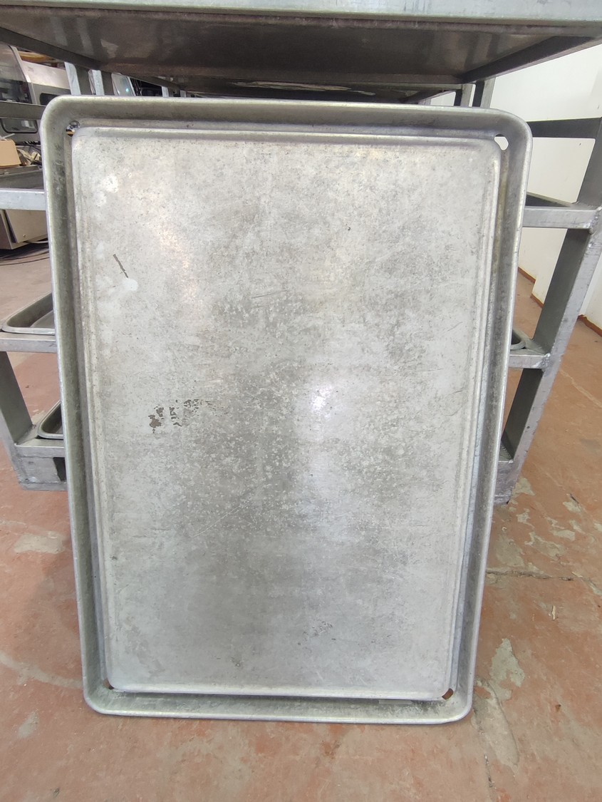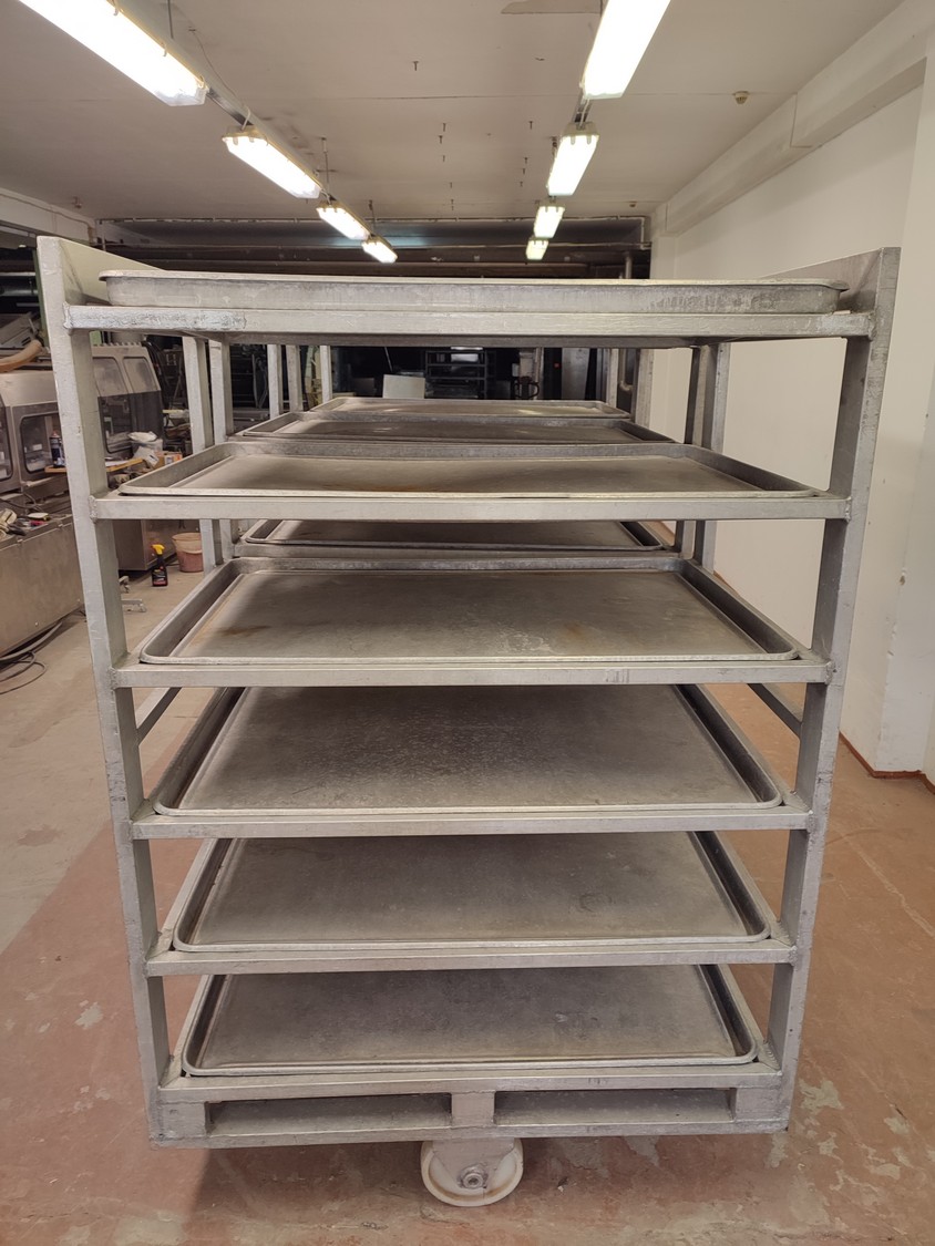 3 aluminum defrosting trolleys, (3) x 6 floors, floor dimensions: 805 mm x 1155 mm, distance between floors: 260 mm, with 18 baking trays, baking tray dimensions: 765 mm x 1110 mm, total dimensions: (3x) 805 mm x 1210 mm x 1780 mm.