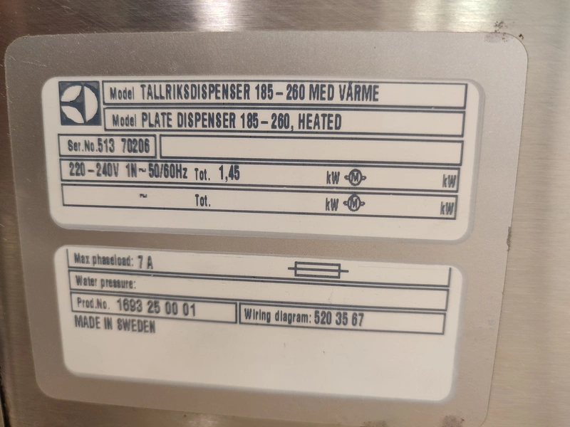 Electrolux mobile plate dispenser, model: PLATE DISPENSER 185-260 HEATED, number: 1693 25 00 01, 220-240 V, 1 Ph, 50/60 Hz, 1.45 kW, dimensions: 440 mm x 730 mm x 960 mm.