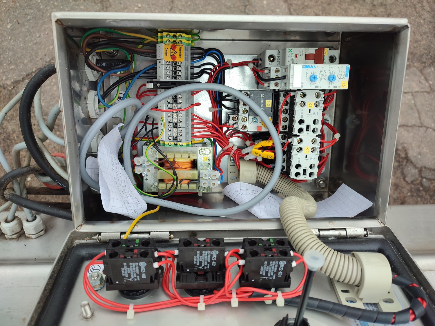 RTL s/s lifter for 200 liter meat bins, model: RTL 6124-NKS, serial number: 6507/2, year of construction: 2003, 230/400 V, 6 A, 0.55 kW, weight: 250 kg, dimensions: 1025 mm x 1250 mm x 3275 mm. Incomplete.