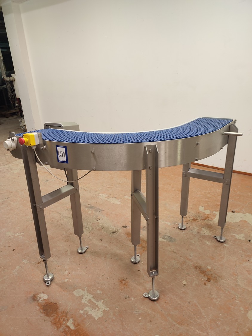 90° curve conveyor, s/s frame, plastic mesh belt, belt width: 255 mm, total dimensions: 1200 mm x 1300 mm x 1050 mm.
