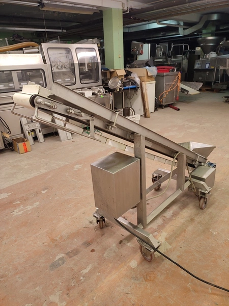 Annala Foodtech mobile elevating belt with infeed bunker, type: KOLAKULJETIN, serial number: 2328, year of construction: 2005, 380 V, 0.37 kW, weight: 100 kg, s/s frame, plastic belt with dividers, belt width: 150 mm, divider height: 40 mm, distance between dividers: 190 mm, elevating height: 1200 mm, total dimensions: 2200 mm x 600 mm x 1270 mm.
